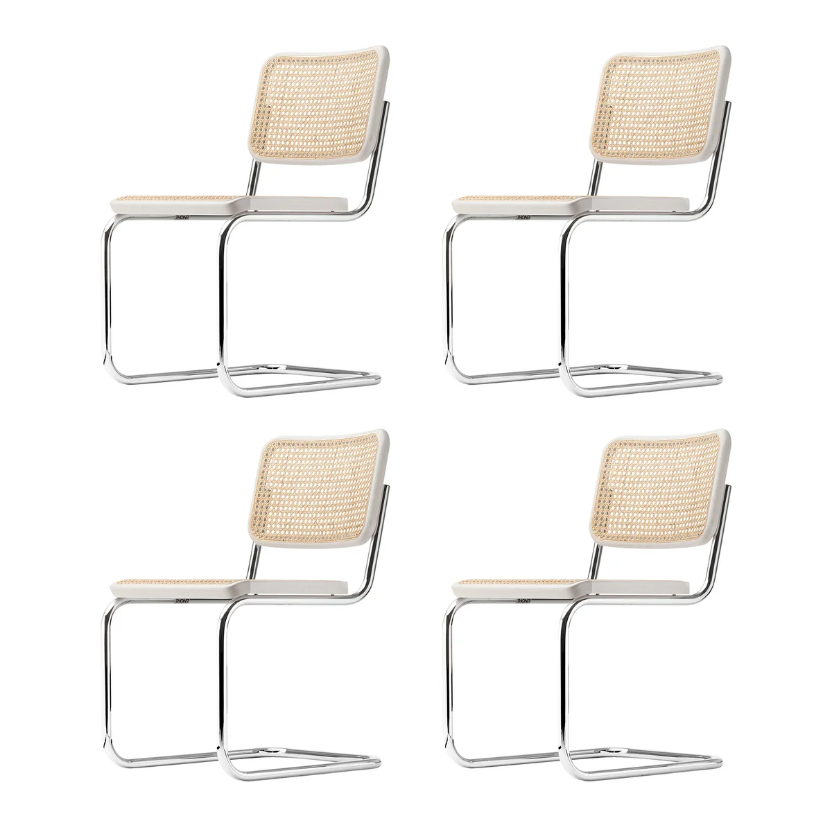 Grâce à sa réduction esthétique et à sa clarté, S 32 s'intègre dans de nombreux espaces privés et publics : Salles de conférence, zones d'attente, restaurants ou même dans sa propre salle à manger ou son bureau. La structure en acier tubulaire est disponible en version chromée ou laquée en couleur et les éléments en bois sont en hêtre teinté ou en noyer huilé. Le revêtement en cannage de différentes couleurs est soutenu par un tissu synthétique qui assure la stabilité.
