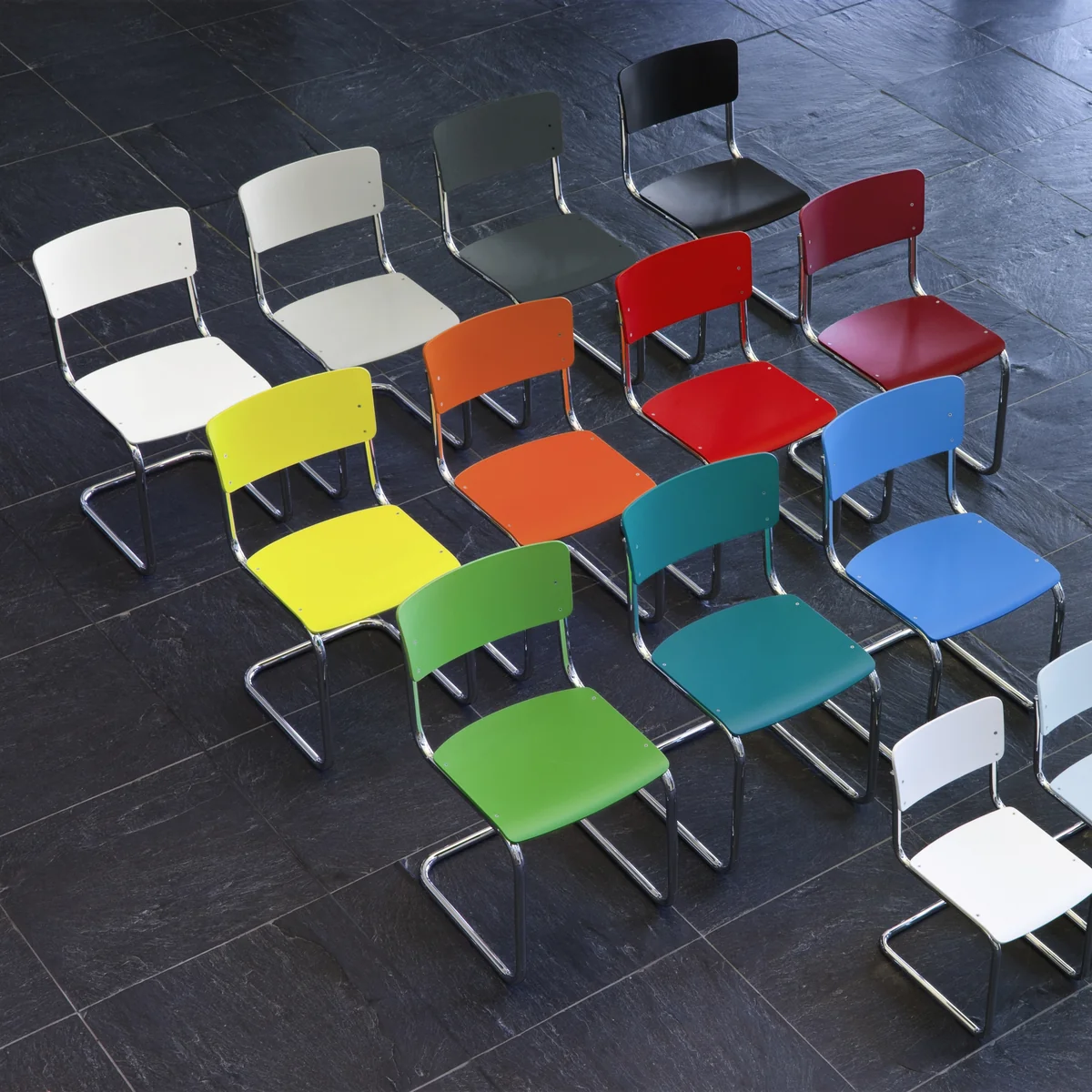 Le piètement en tube d'acier est disponible en version chromée ou laquée, tandis que les garnitures en bois moulé sont fabriquées en hêtre teinté, vernis à film fermé ou avec une laque structurée dans différentes couleurs.