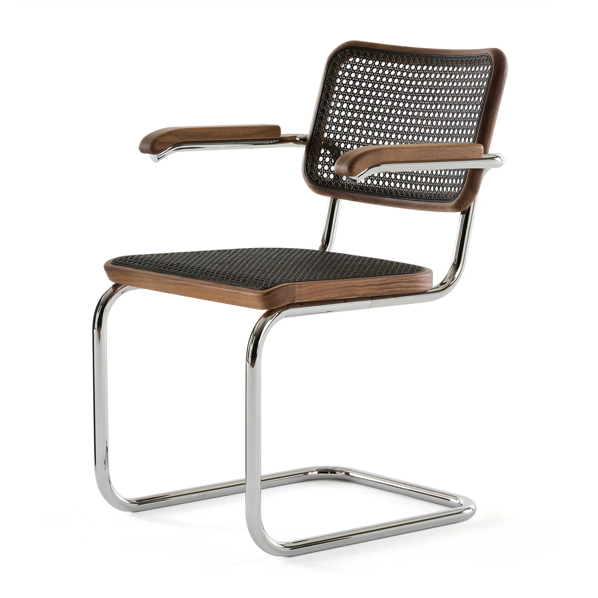 La chaise à accoudoirs S 64 de Marcel Breuer pour Thonet fait probablement partie des chaises les plus connues du 20. siècle. La chaise cantilever la plus produite au monde séduit par son association iconique de tube d'acier, de bois et de cannage. La chaise cantilever est également disponible avec une assise rembourrée et un revêtement en cuir, en tissu ou en maille dans différentes combinaisons de couleurs.