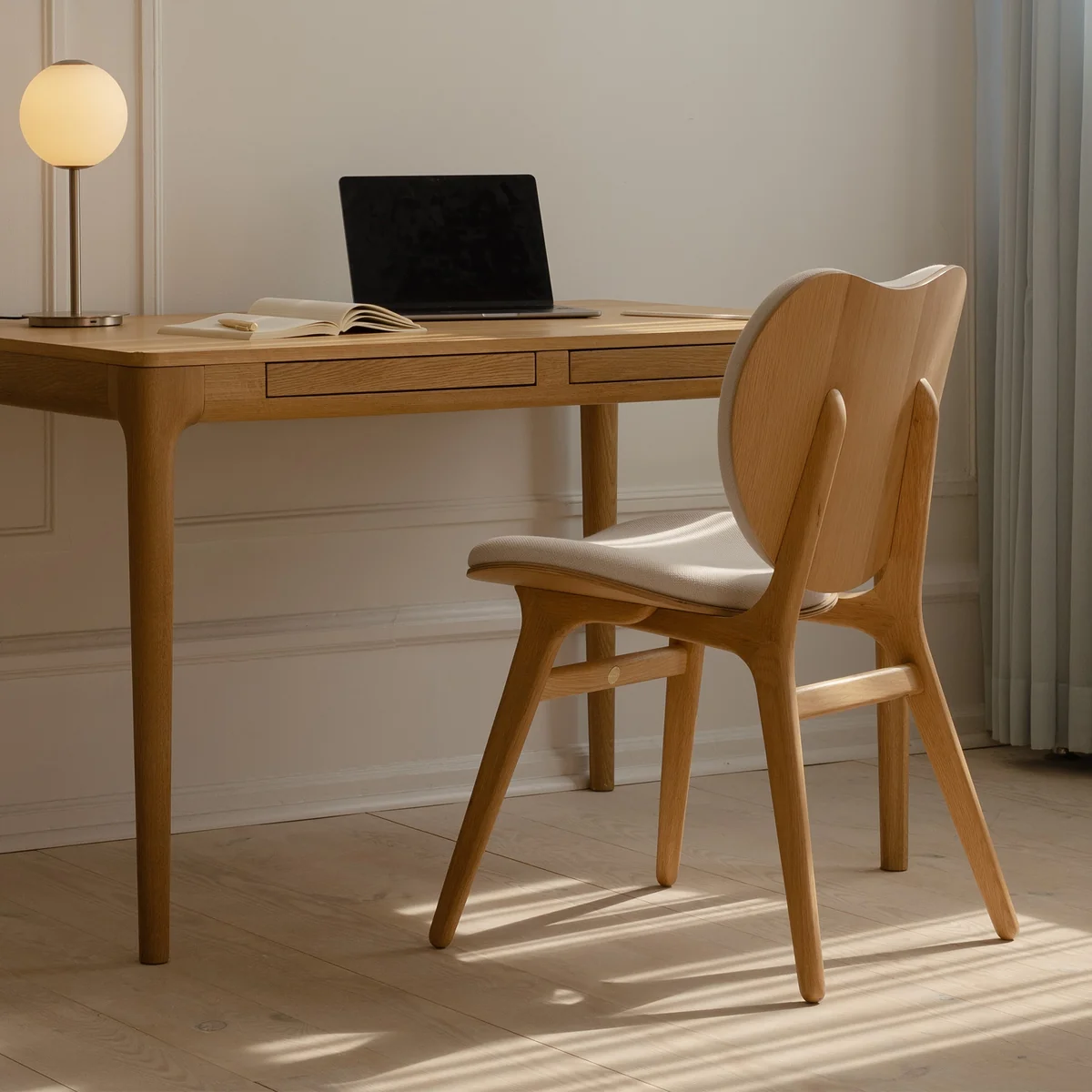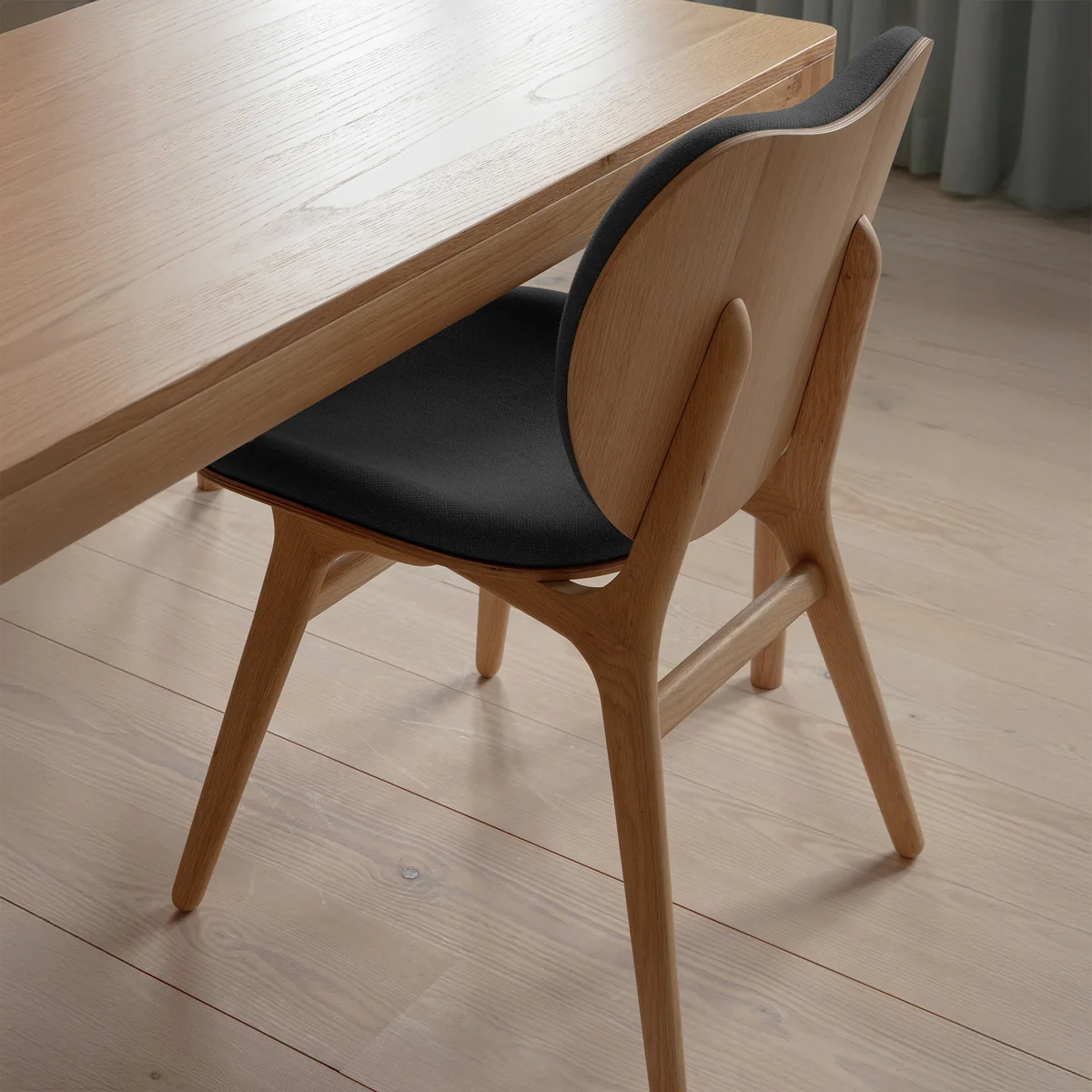 La chaise A Conversation Piece, conçue par le designer Anders Klem, allie des lignes douces et organiques à un artisanat d'art. Son piètement sculptural en chêne massif et plaqué chêne crée une sensation de légèreté et de chaleur, tandis que le dossier délicatement incurvé et les raccords sans soudure complètent le design.