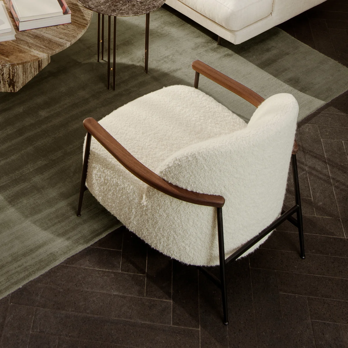 Gubi - Sejour Lounge Chair avec accoudoirs, noir mat / huilé noyer / Dedar Flair Special 201