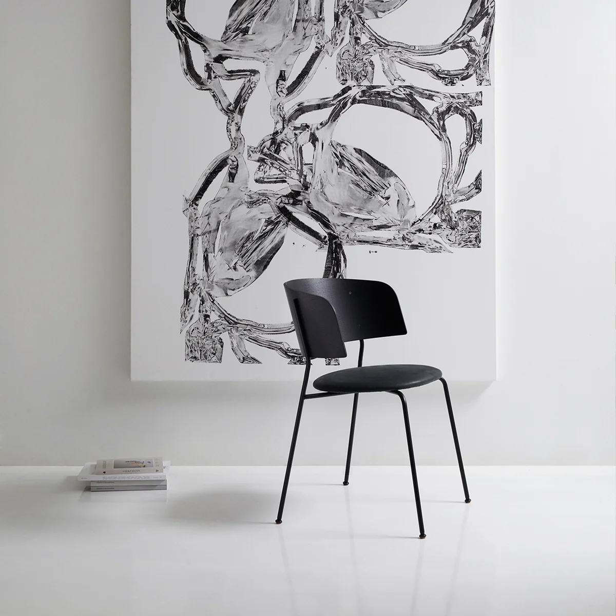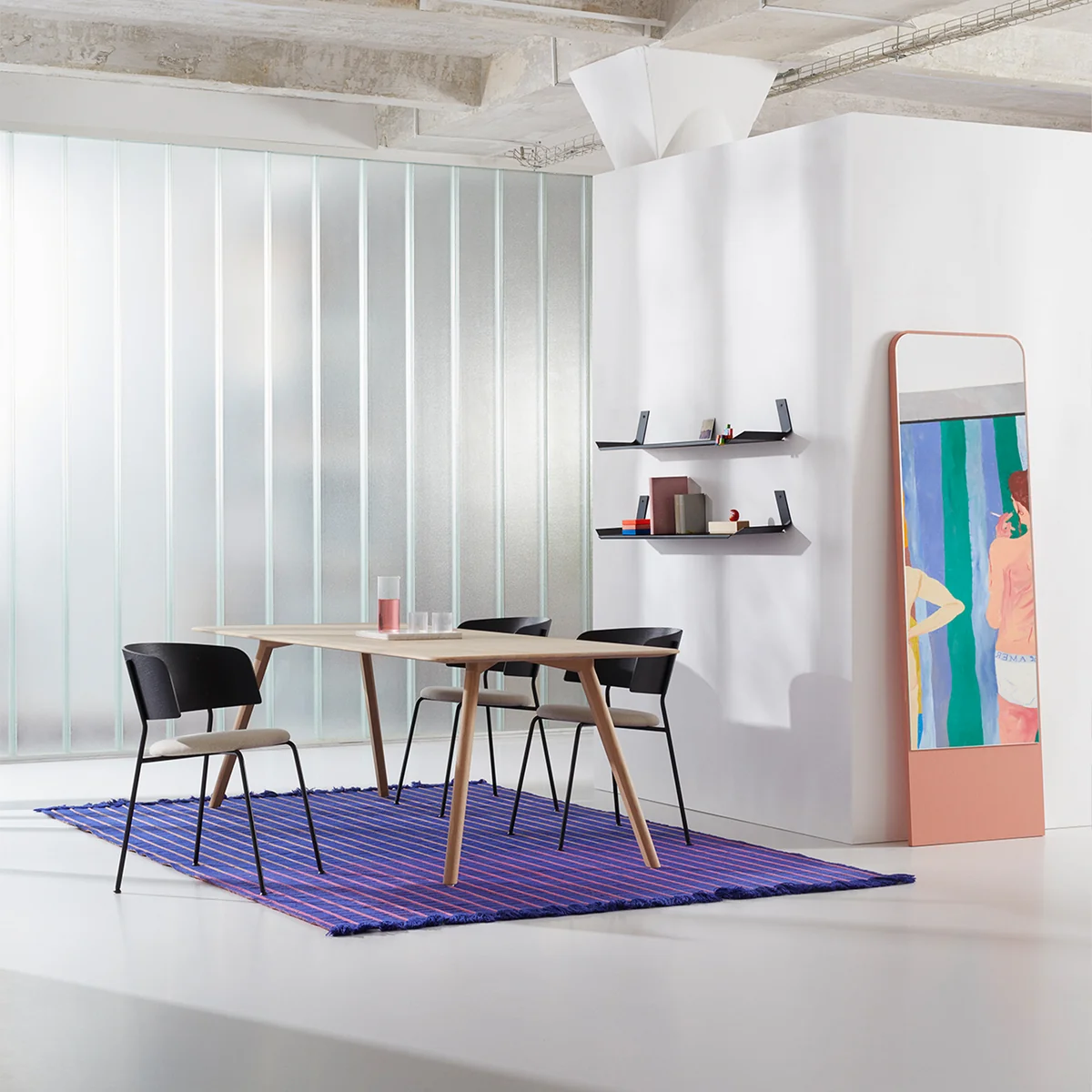 La chaise Wagner chaise avec accoudoirs se compose d'un piètement à quatre pieds en acier revêtu par poudre. Cela confère à la chaise une certaine légèreté et permet de l'empiler facilement. L'assise et le dossier sont disponibles avec différentes surfaces de placage et différentes possibilités de rembourrage. La chaise, fabriquée à Berlin, s'intègre ainsi parfaitement dans n'importe quelle ambiance.