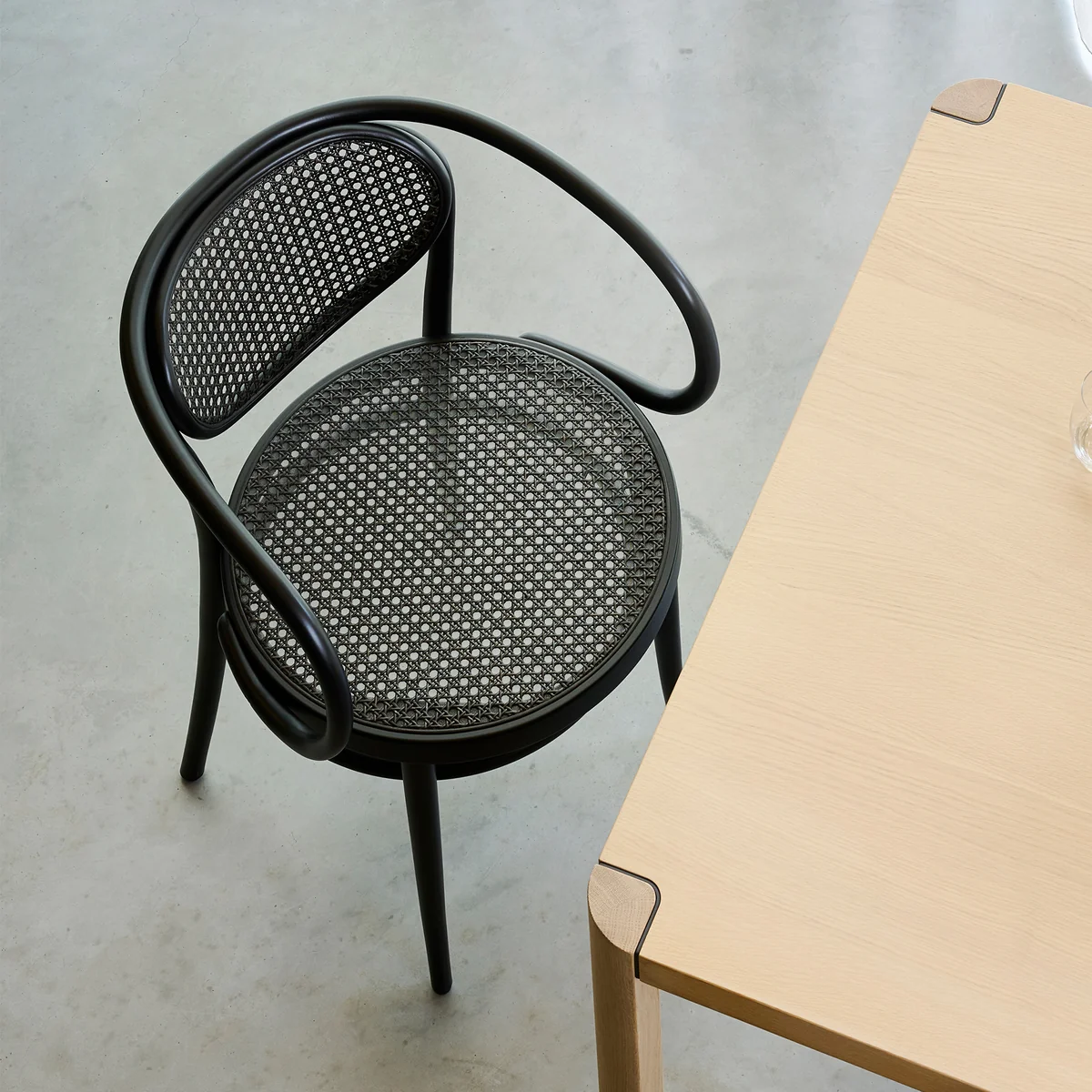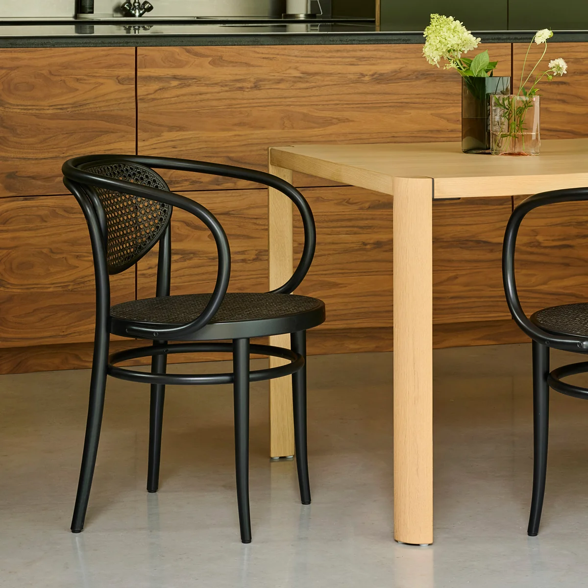 La chaise à accoudoirs 210 R, conçue vers 1900 par les frères Thonet , est considérée comme un chef-d'œuvre de l'artisanat et du langage des formes. Le dossier et les accoudoirs sont courbés à partir d'une seule pièce de bois de hêtre massif - un symbole de précision technique et d'esthétique intemporelle. Avec ses lignes harmonieuses, la chaise semble presque sculpturale et allie fonctionnalité et légèreté élégante.