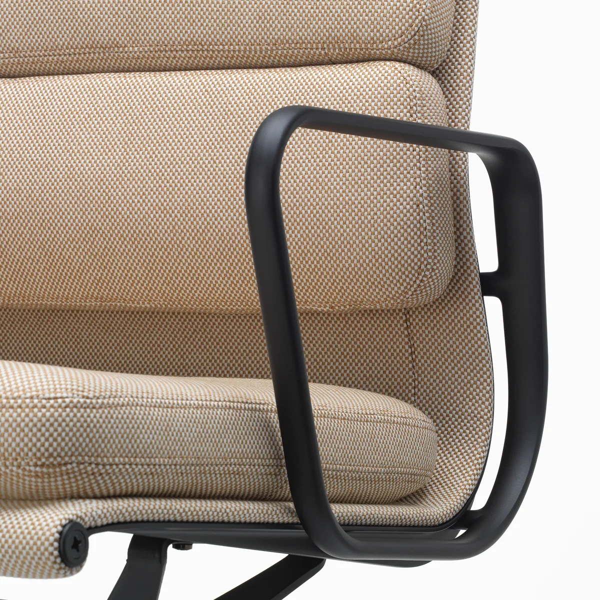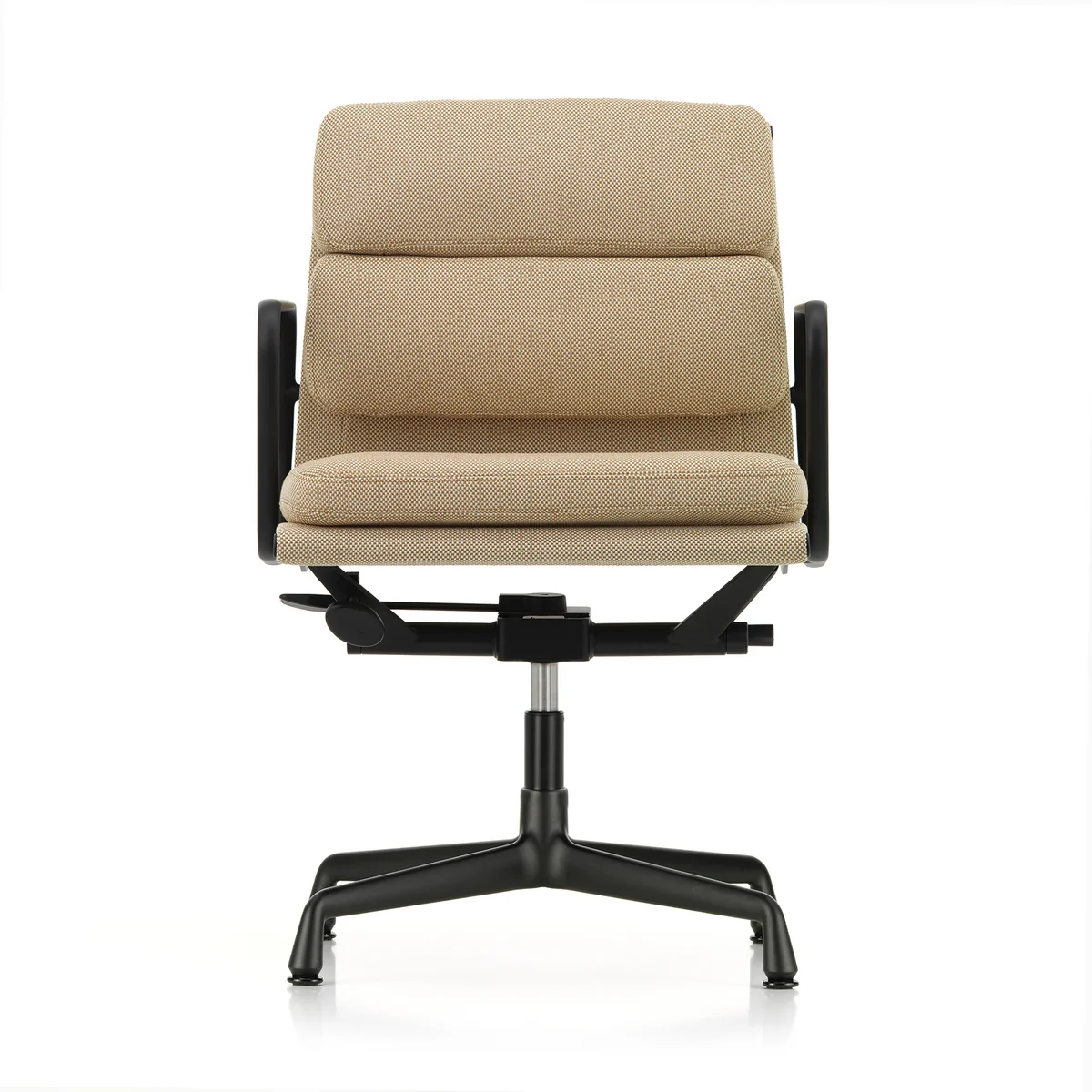La chaise de bureau EA 231 Soft Pad avec accoudoirs de Vitra est équipée d'un mécanisme de basculement réglable et d'une géométrie d'assise droite, ce qui la rend idéale pour le travail au bureau. Cependant, comme il n'a pas de roulettes, il dégage une atmosphère confortable et se distingue des chaises de bureau pivotantes traditionnelles. Il s'intègre donc parfaitement dans un bureau à domicile haut de gamme.