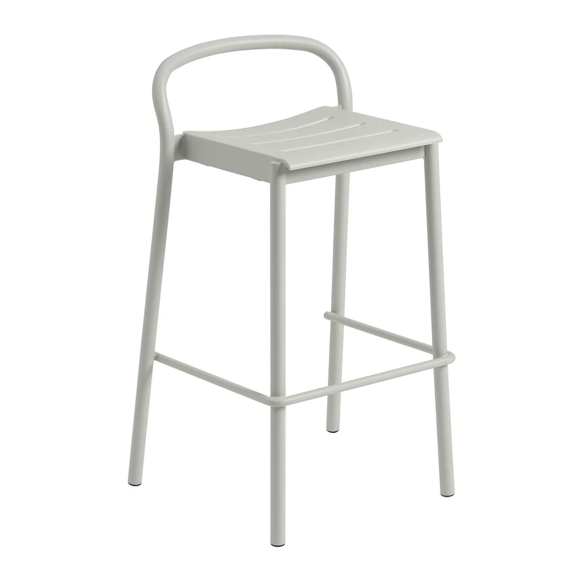 Le tabouret de bar Outdoor Linear Steel de Muuto est maintenu visuellement propre par des lignes épurées afin de garantir une esthétique durable. Son contraste entre le dossier incurvé et les pieds droits assure une expression moderne sur les terrasses privées et publiques, sur le balcon et dans le jardin.
