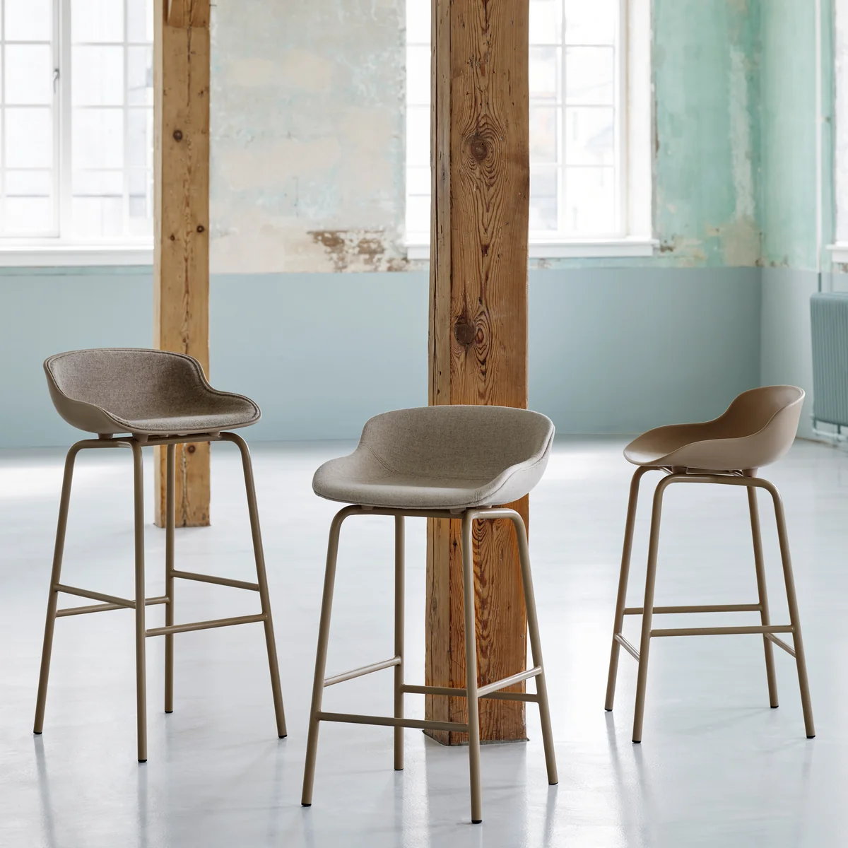 Le tabouret de bar se compose d'un cadre à quatre pieds en acier thermolaqué ou en chêne et d'une coque d'assise en polypropylène. Les deux parties sont laquées de la même couleur, ce qui donne au tabouret un aspect particulièrement calme et uniforme. Disponible en différentes couleurs et hauteurs, le tabouret de bar s'intègre parfaitement dans différentes ambiances, espaces publics et privés.