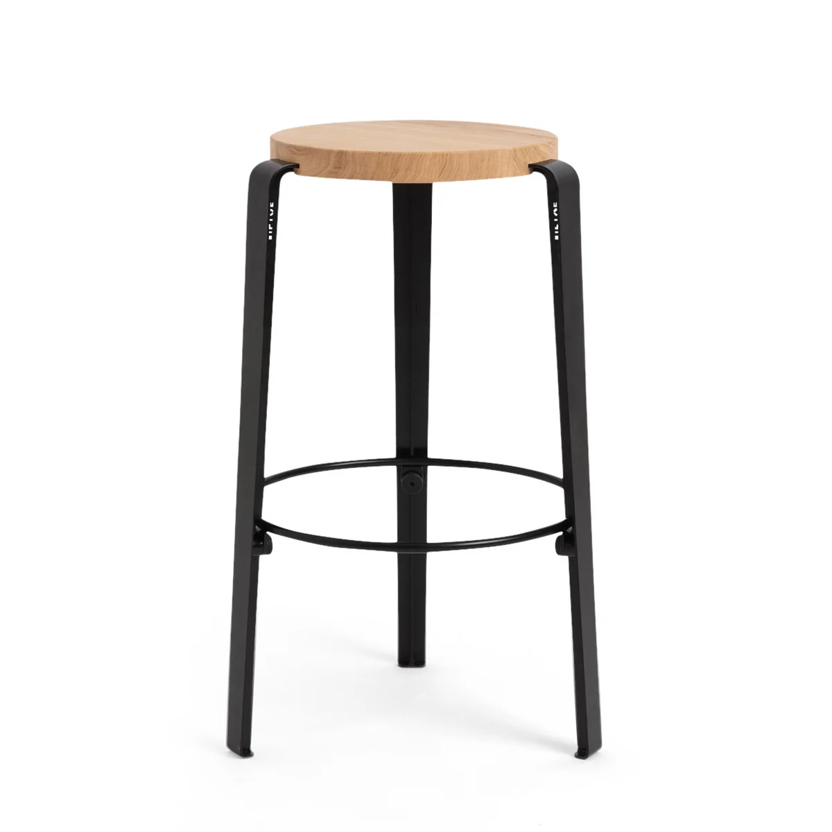 L'assise du tabouret de bar Lou est en chêne massif, tandis que les pieds sont en acier thermolaqué et sont disponibles en différentes couleurs.