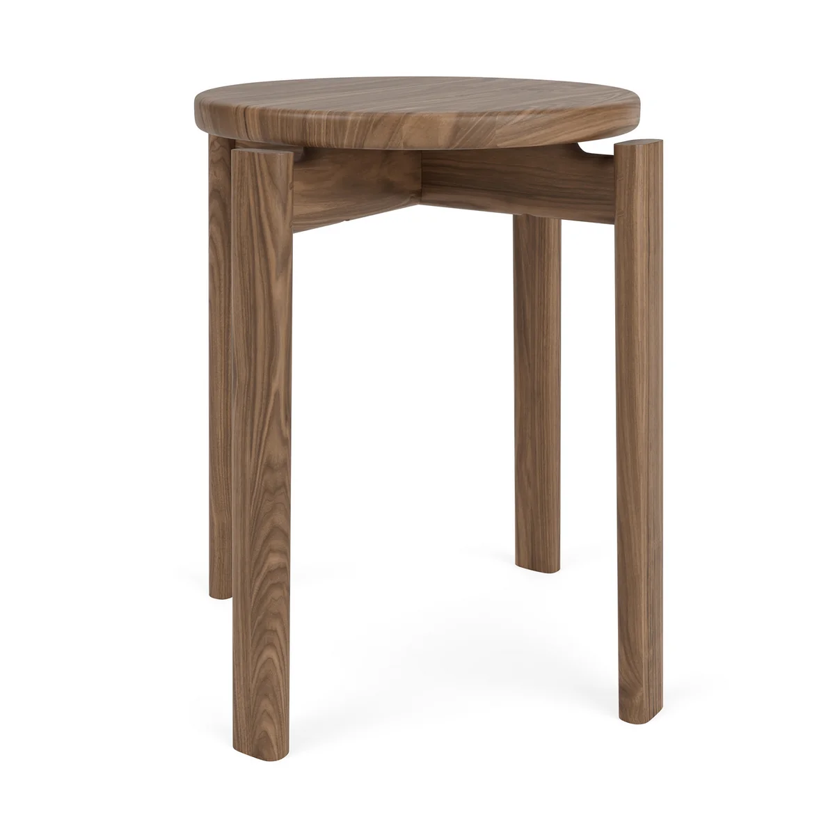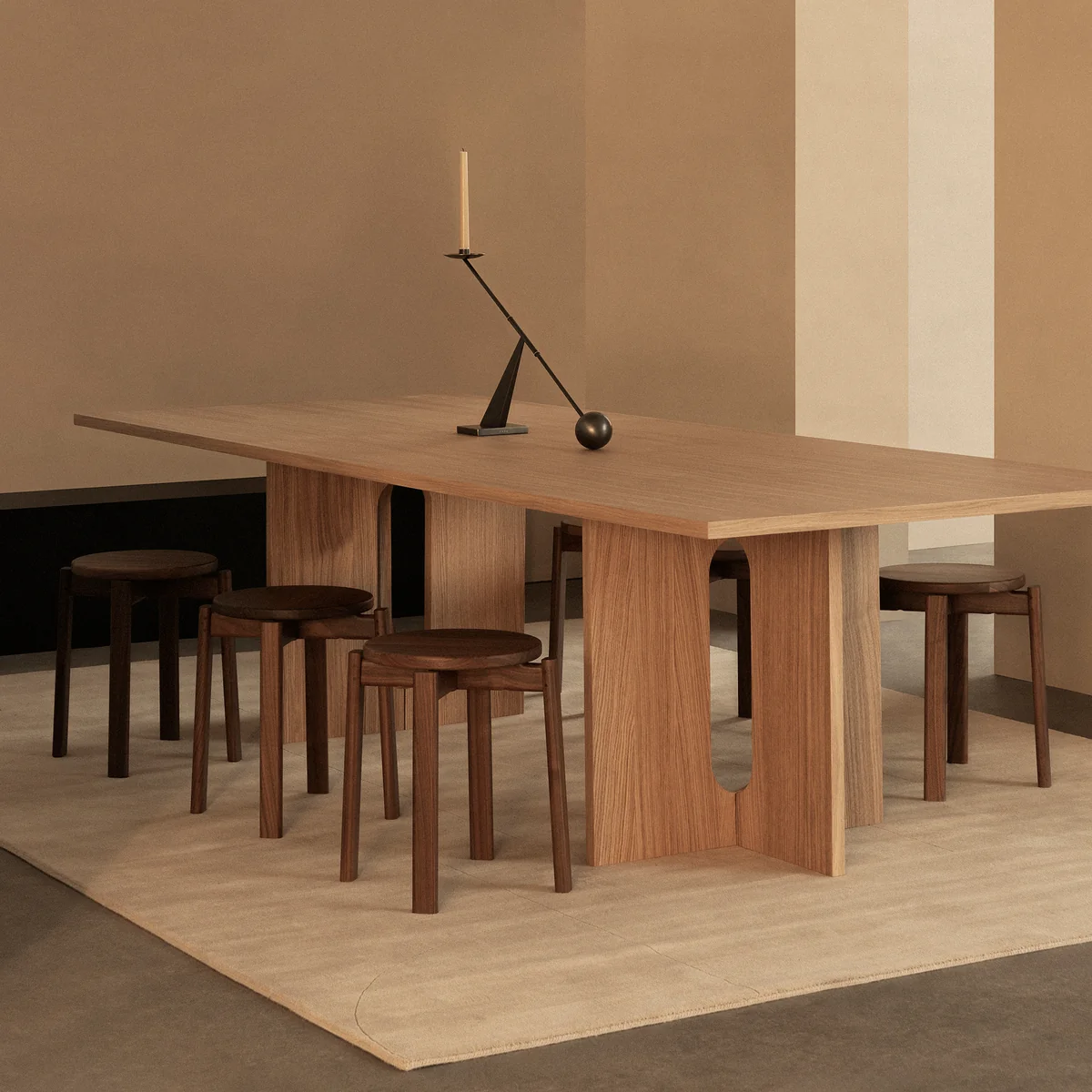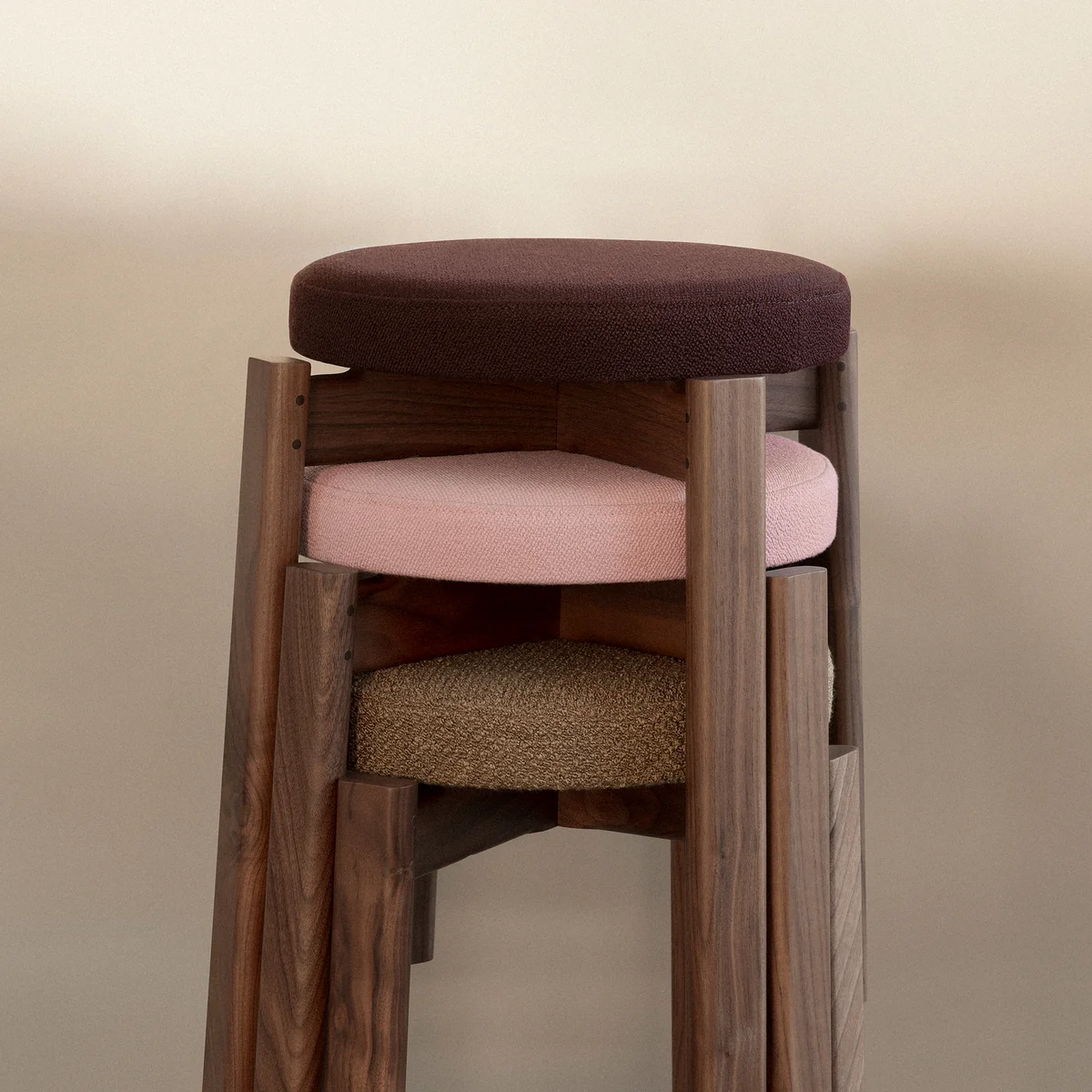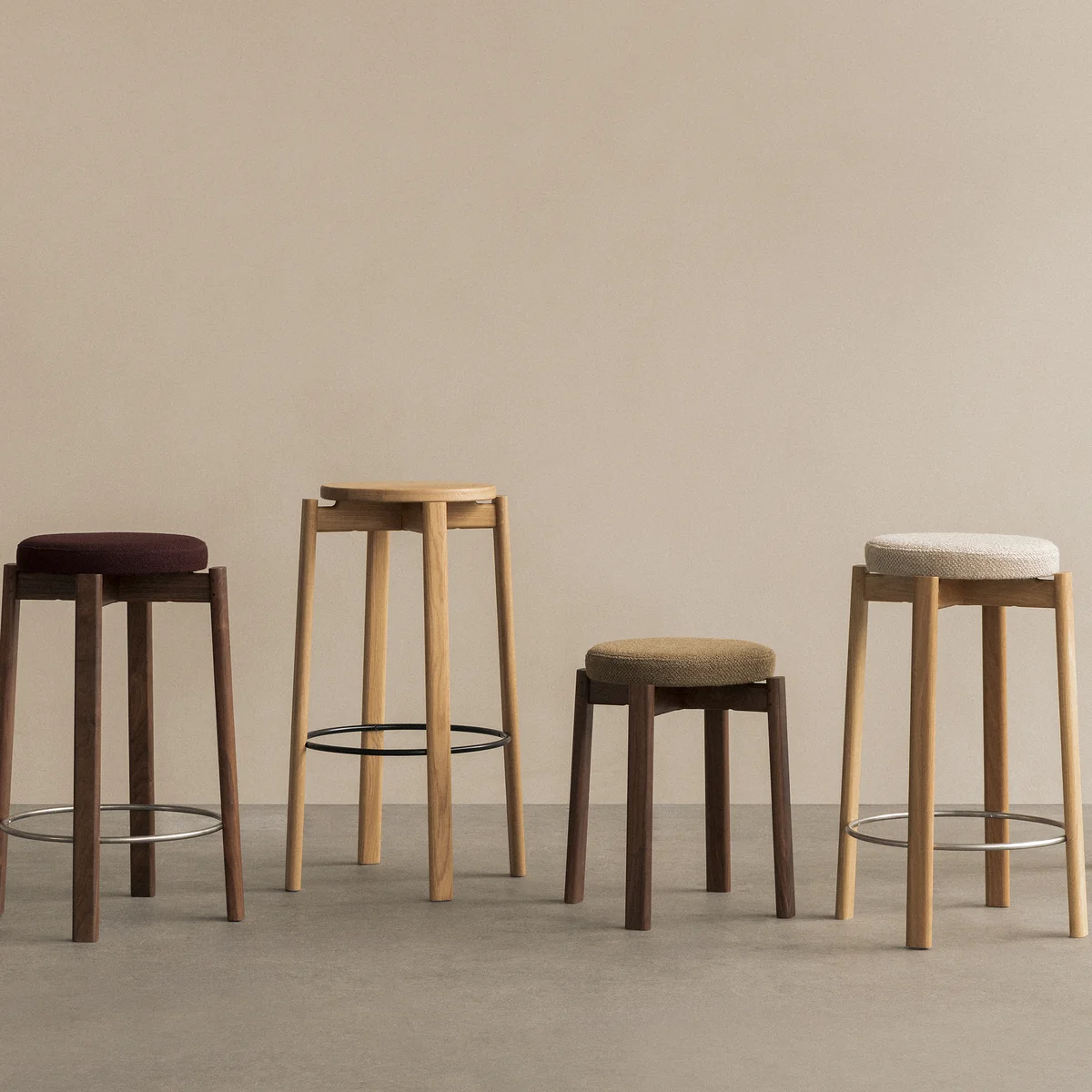 Audo fabrique le Passage tabouret en bois de chêne ou de noyer certifié FSC®. Le produit est disponible en différentes finitions et est livré en flatpack. Cela permet à l'utilisateur de s'interroger sur le design du tabouret. Selon la version, il est également disponible avec un coussin d'assise.