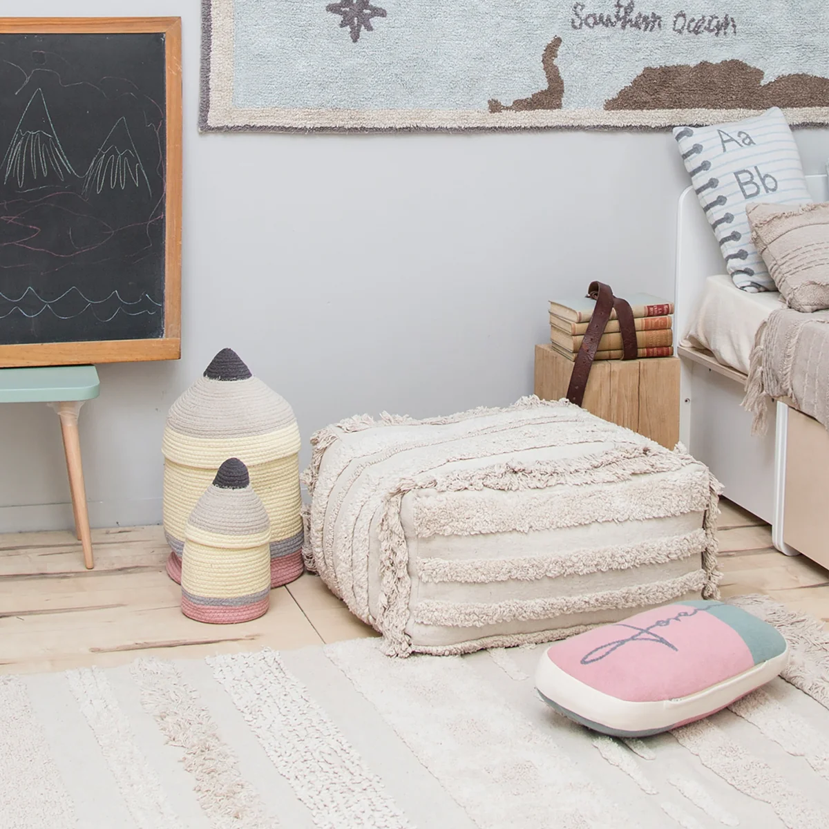 Le Early Hours Pouf de la maison espagnole Lorena Canals se distingue par son aspect boho. Le pouf peut être merveilleusement utilisé comme siège supplémentaire, comme repose-pieds ou même comme table. Ce pouf polyvalent est fabriqué en coton et en billes de polyestyrène.