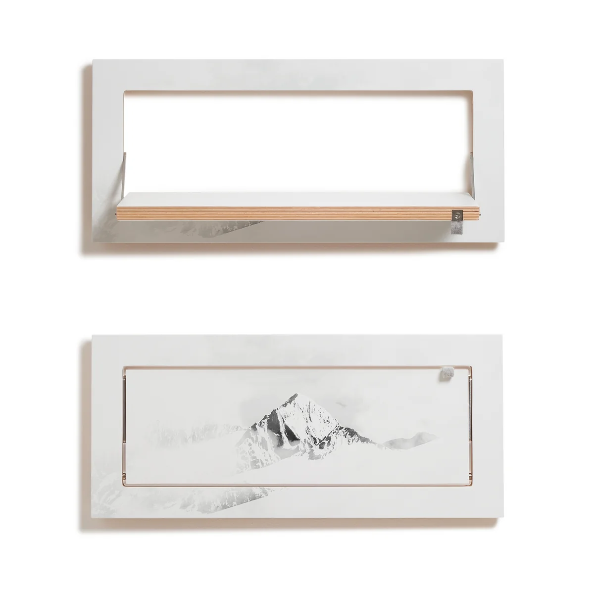 Les étagères sont fabriquées en bouleau multiplex avec des charnières en acier inoxydable. Elles sont peintes à la main et sont disponibles en différentes couleurs. Une petite boucle en feutre facilite le rabattement de l'étagère.