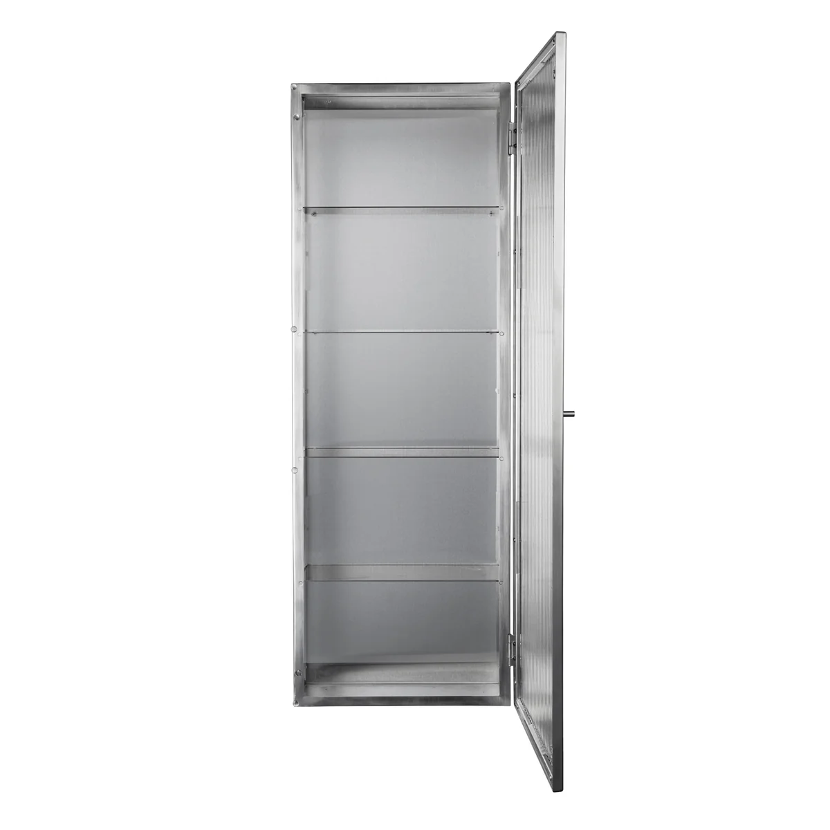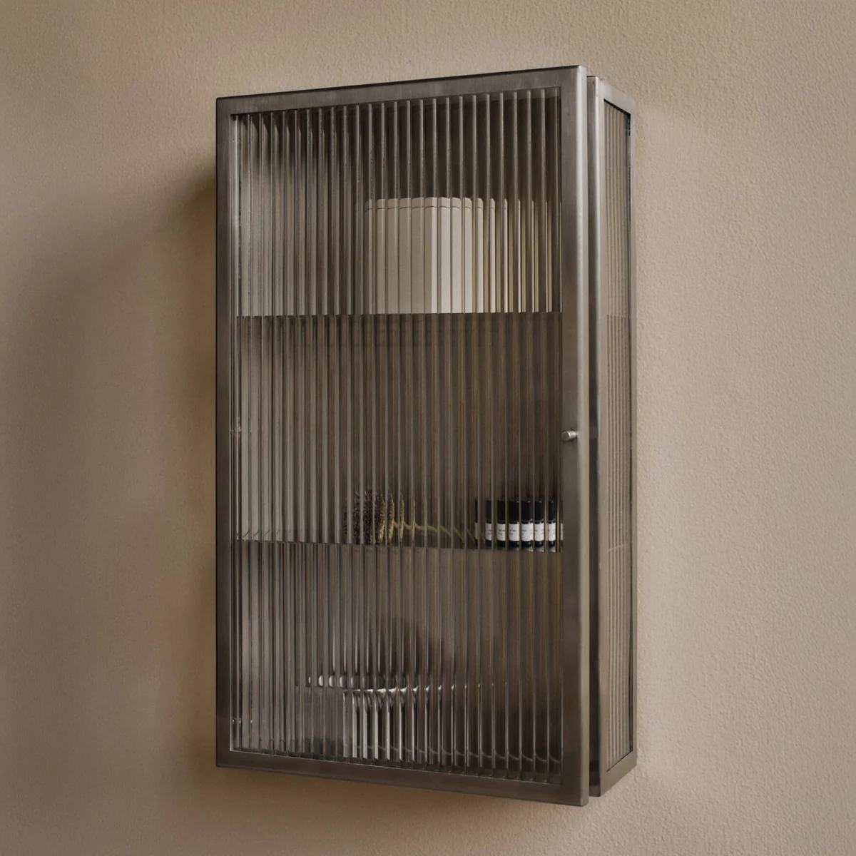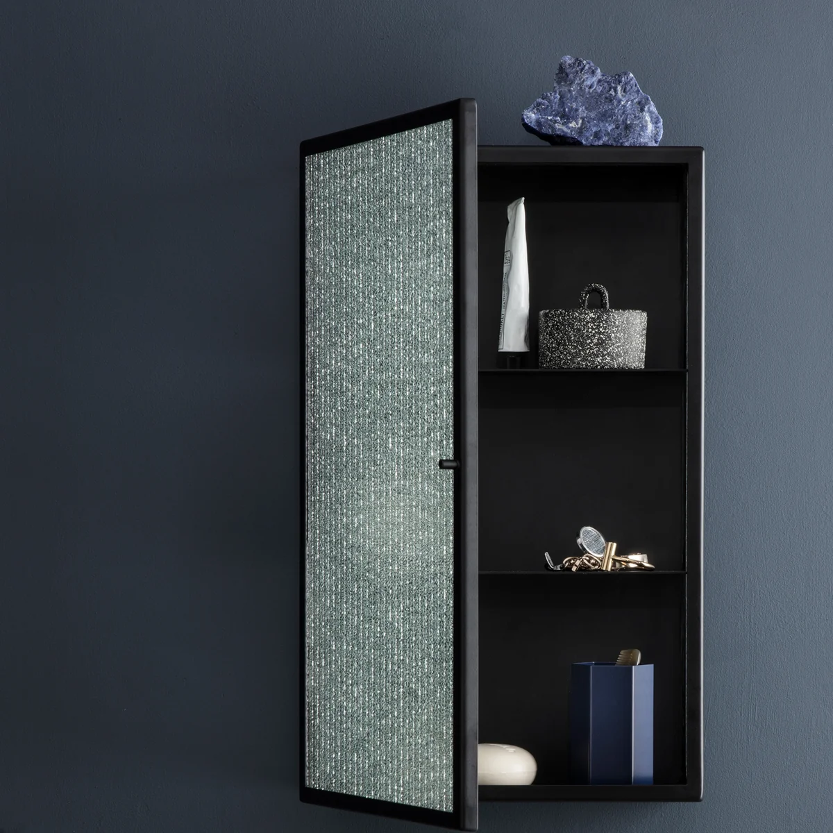 L'interaction entre le verre armé et le métal s'intègre de manière marquante dans chaque intérieur et donne néanmoins une impression de légèreté grâce au verre semi-transparent. L'armoire murale au caractère industriel s'intègre aussi bien dans la salle de bains que dans la cuisine ou la salle à manger. Les produits cosmétiques et les serviettes, mais aussi les épices, la vaisselle et les verres y trouveront une place de choix.