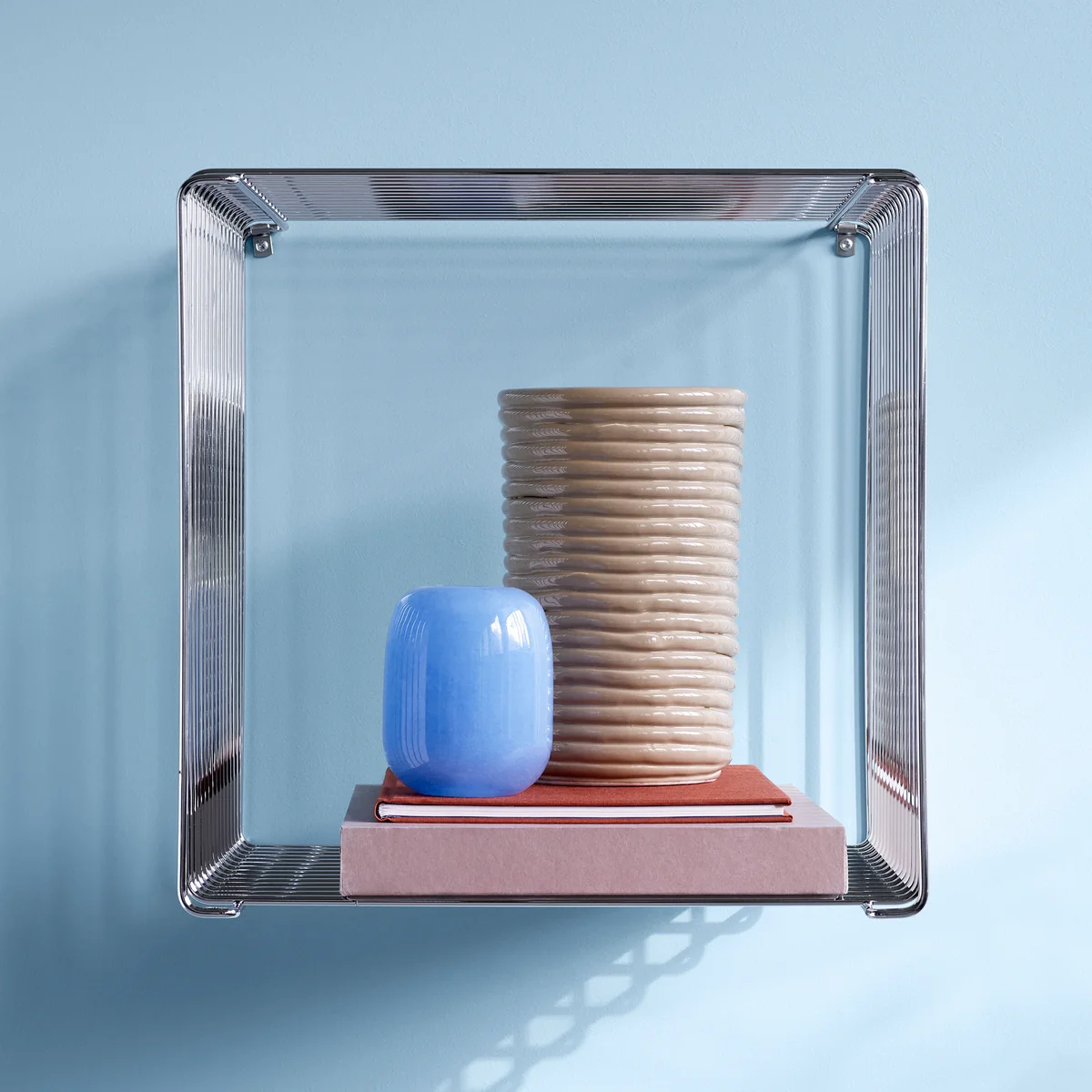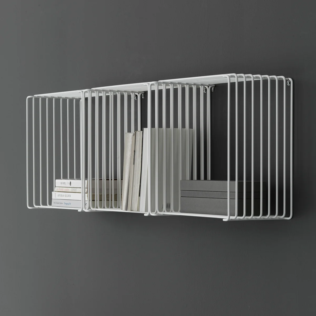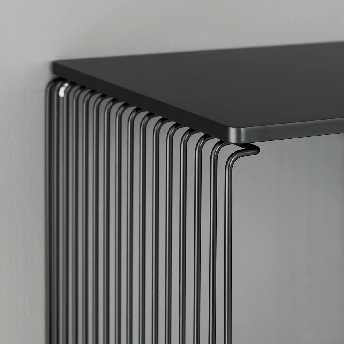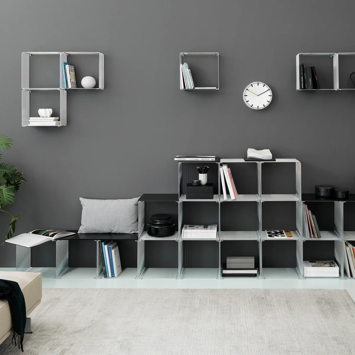 L'étagère se compose d'une structure en fil métallique disponible en deux profondeurs. Différents accessoires tels que des étagères ou des plaques de recouvrement complètent Wire de manière optimale et font de la construction en fil métallique un objet pratique et intemporel dans l'espace de vie.
