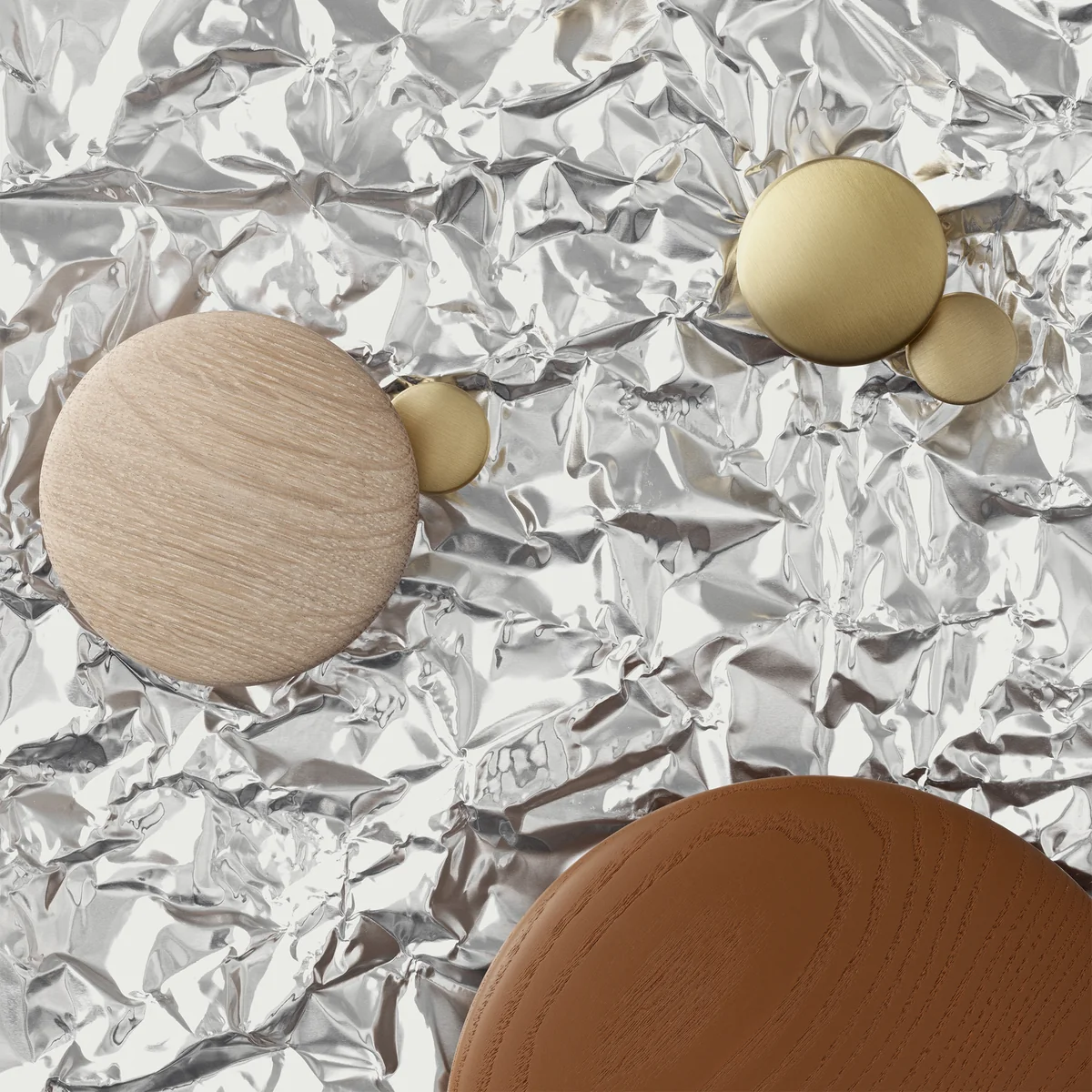 Contrairement aux Dots originaux en bois, les Dots Metal sont fabriqués en aluminium, en laiton ou en acier inoxydable. Le souvenir d'une poignée de porte ou d'une poignée de tiroir est dû à la forme des Dots.