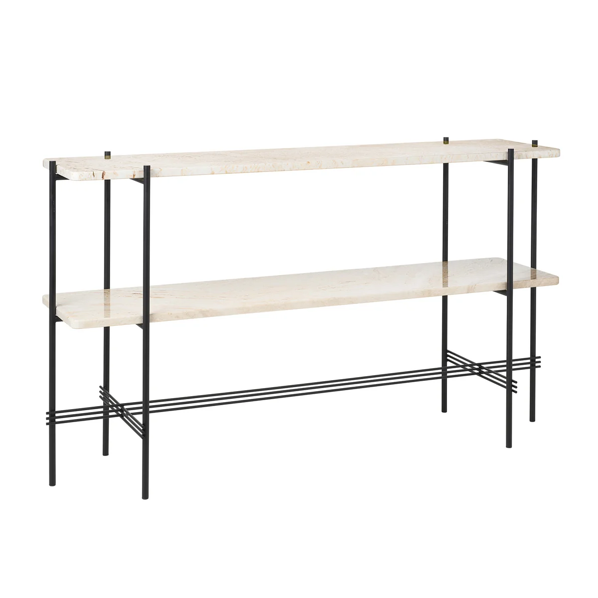 Le Travertine de Gubi est une commode sculpturale, qui peut être Travertine Table basse basée sur . Comme son modèle, il tire son énergie des contrastes : de minces cadres métalliques rencontrent les robustes compartiments en belle pierre de travertin. Il a été conçu par le duo de designers GamFratesi pour le restaurant "The Standard" à Copenhague. Avec son aspect sculptural et le matériau noble, la commode s'intègre parfaitement dans l'ambiance et convient comme étagère, commode, pour le rangement, la présentation et le stockage.