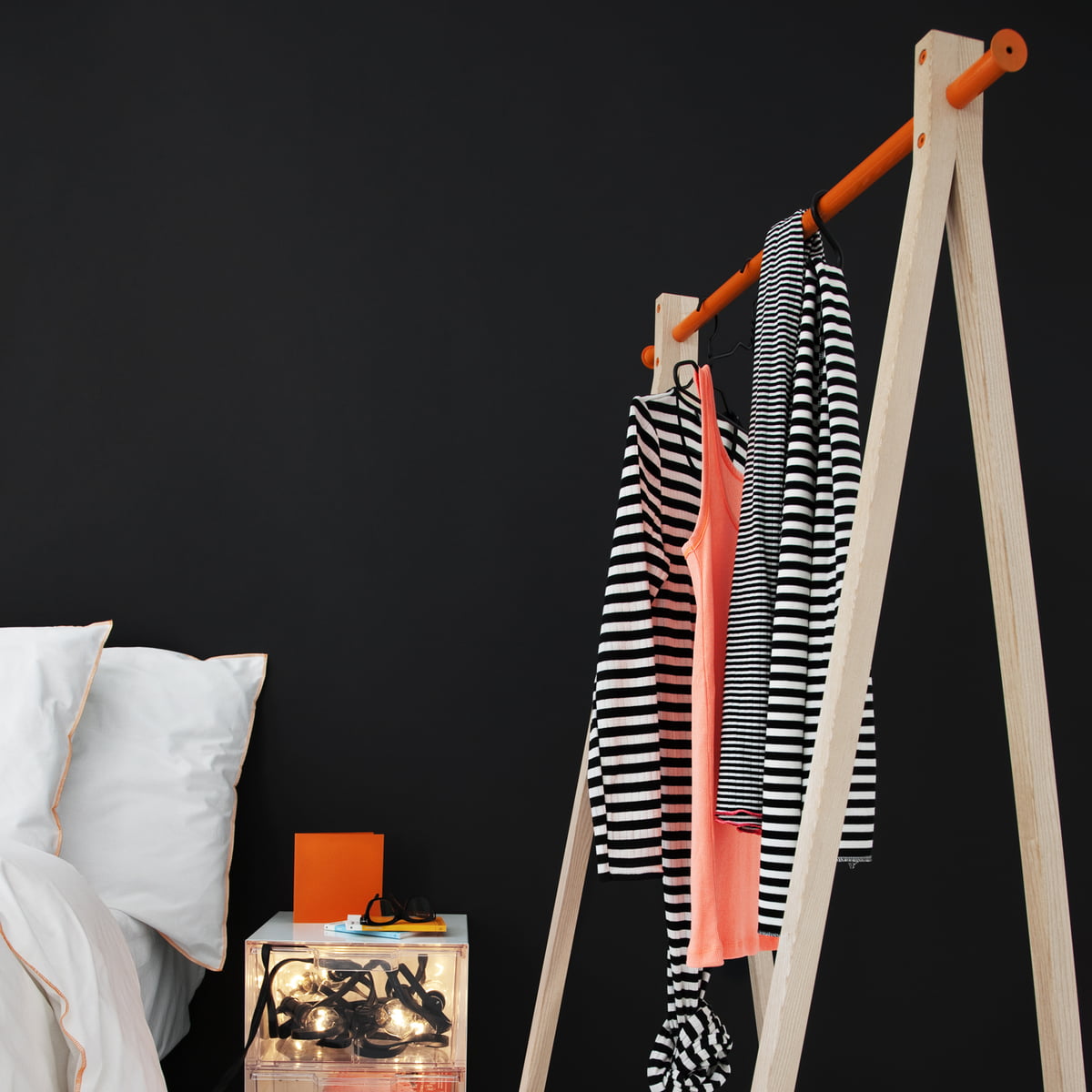 De simples tréteaux en bois de frêne naturel maintiennent une tringle noire ou blanche en aluminium sur laquelle peuvent être suspendus des vêtements. Nomess propose la garde-robe en différentes tailles : avec une tringle en aluminium de 90 cm ou de 120 cm de long.