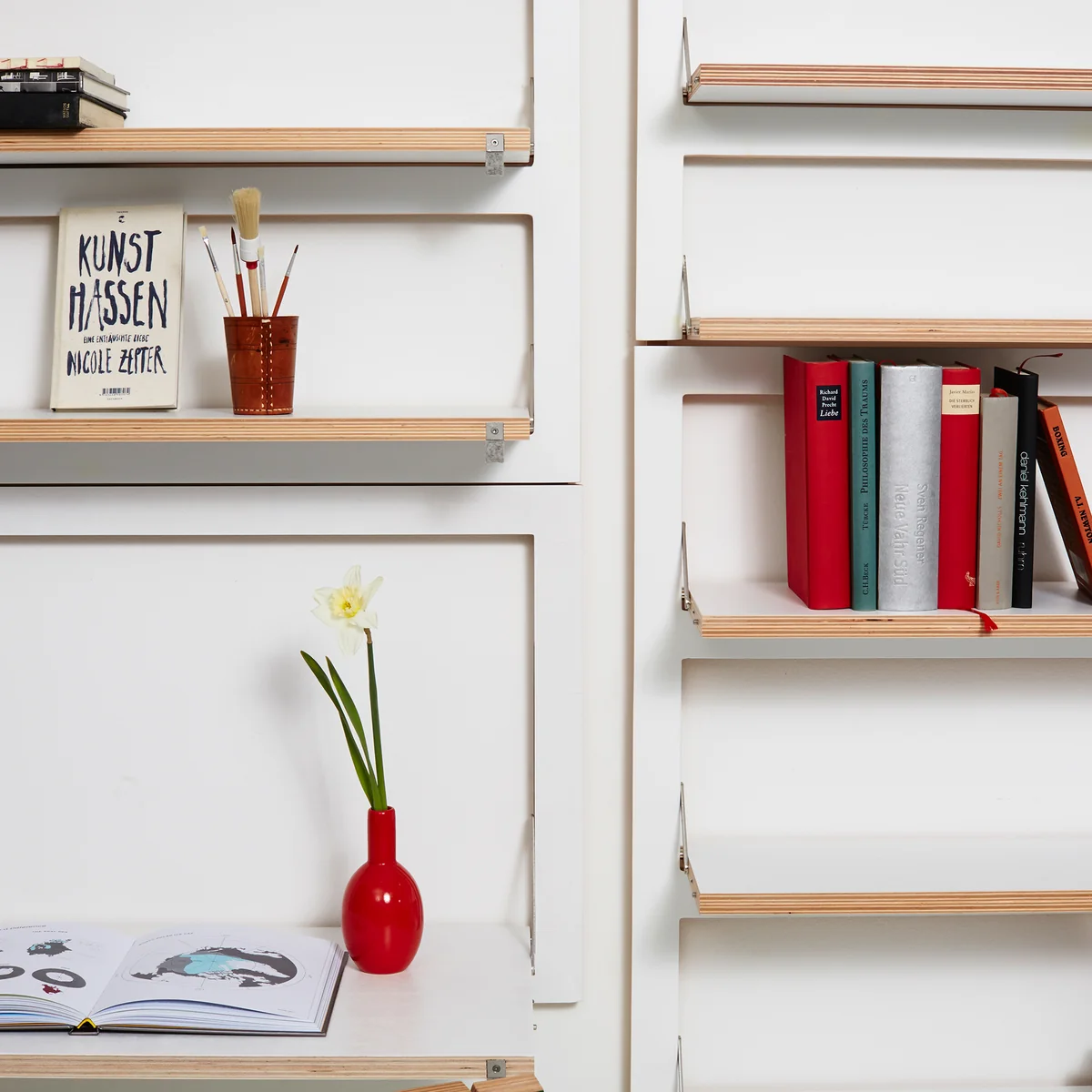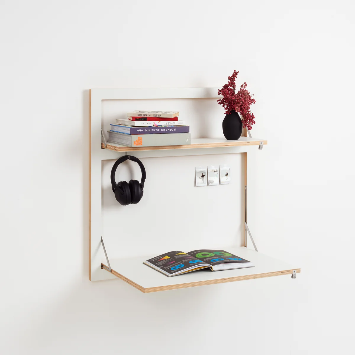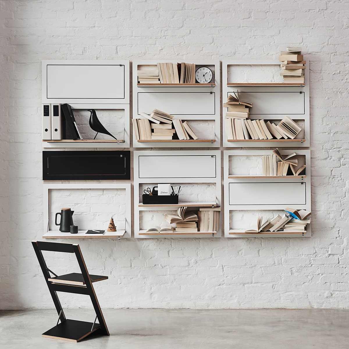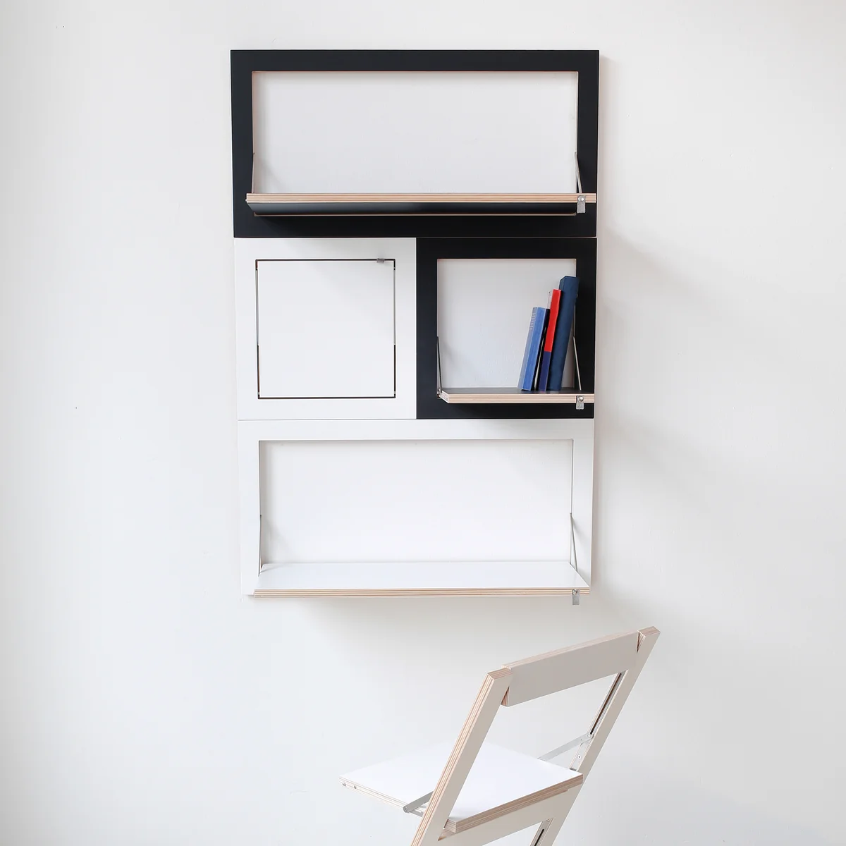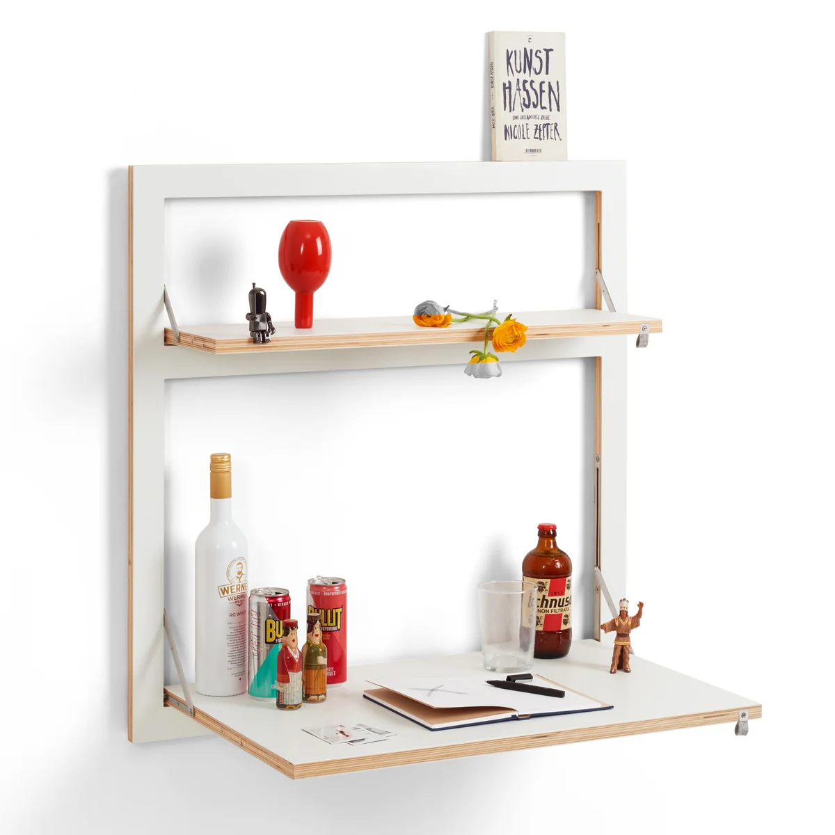 Fläpps Le secrétaire/in de Ambivalenz est un secrétaire mural fonctionnel et peu encombrant qui se déplie. Monté à n'importe quelle hauteur et donc utilisable comme place assise ou debout, le secrétaire mural séduit, une fois replié, par sa profondeur extrêmement faible de seulement 3 cm. Déplié, le secrétaire devient un véritable talent multifonctionnel. Fläpps Le secrétaire peut être utilisé comme bureau, table à manger, table de bricolage et bien plus encore.