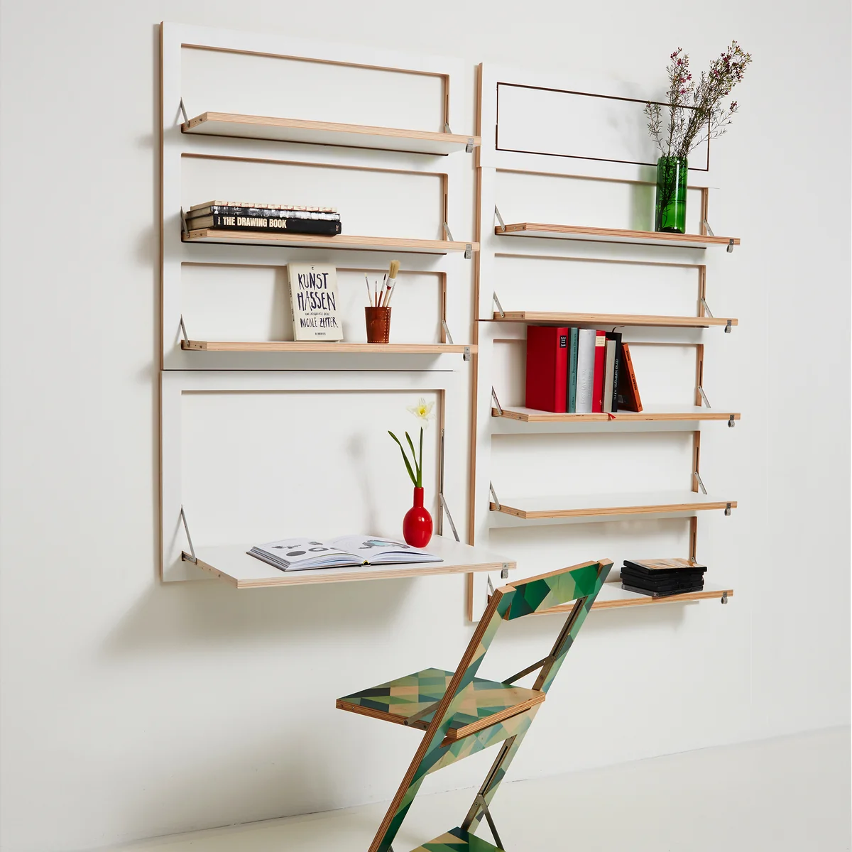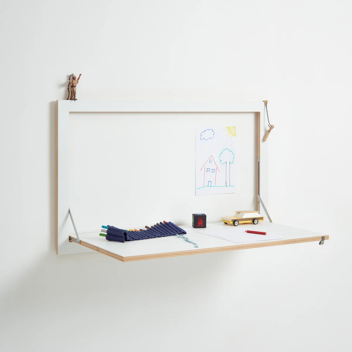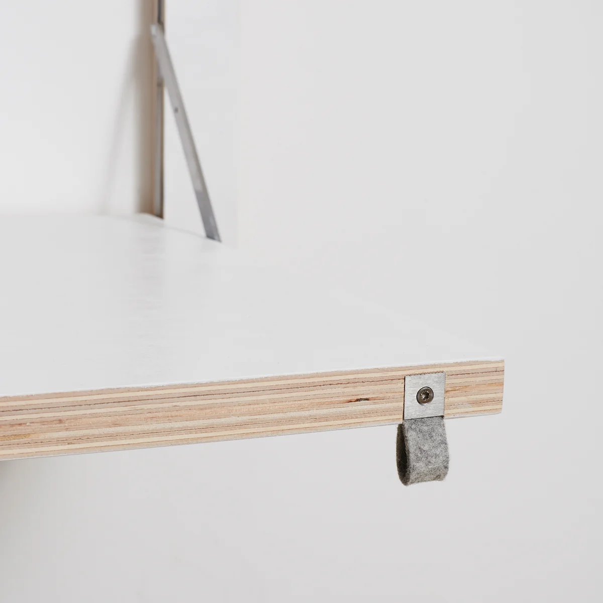Le secrétaire mural est fabriqué en bouleau multiplex certifié FSC®, tandis que les fonctions de pliage sont en acier inoxydable. Une petite boucle en feutre facilite le dépliage du plan de travail. Les surfaces sont vernies à la main et sont disponibles en différentes couleurs et motifs. En blanc, par exemple, le secrétaire se fond dans le mur de la même couleur, tandis qu'un secrétaire avec motif devient un tableau décoratif sur le mur une fois replié.
