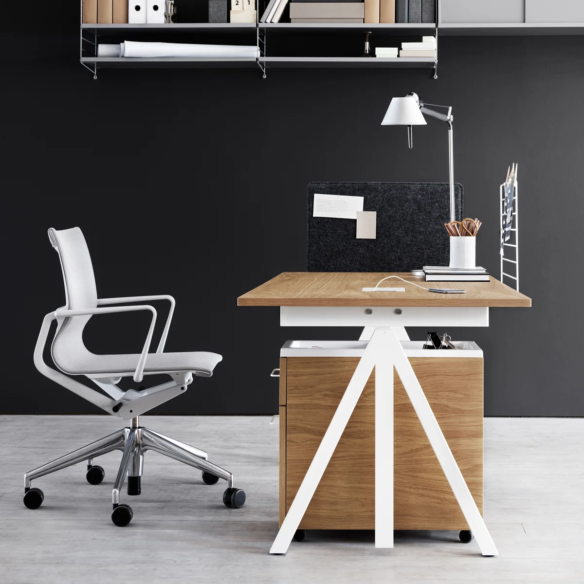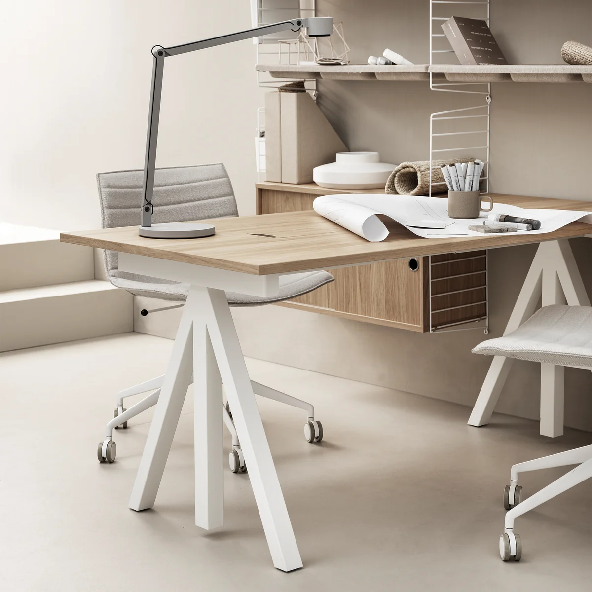 Le bureau réglable en hauteur de la Works collection de String est une table de travail classique, mais sans son aspect lourd. Avec une plage de réglage comprise entre 715 et 1185 mm, il convient aux personnes et aux groupes professionnels de tous types.