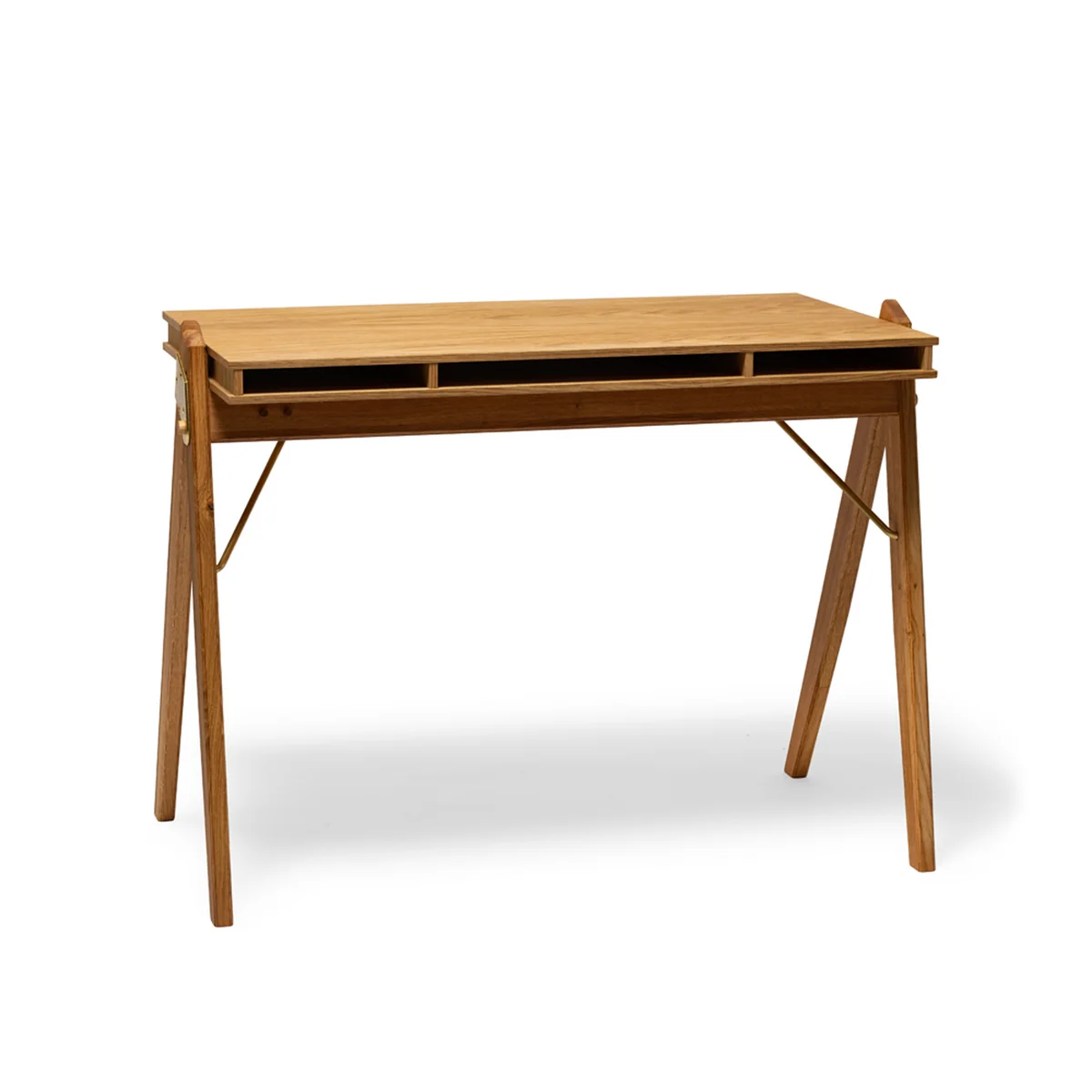 Les ordinateurs portables, magazines, cahiers et autres petits objets peuvent être facilement rangés dans les trois compartiments plats situés sous le plan de travail. La surface de la table reste ainsi libre et dégagée.