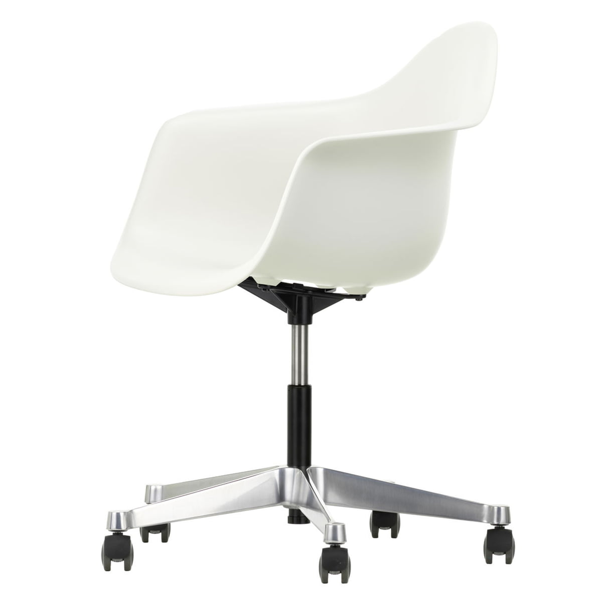 La chaise à accoudoirs PACC est une variante de la chaise en plastique qui a déjà été conçue en 1948 par Charles et Ray Eames. C’était la première chaise industriellement fabriquée. PACC (Pivot Armchair Cast Base on Castors) est la chaise de bureau pivotante de cette série.