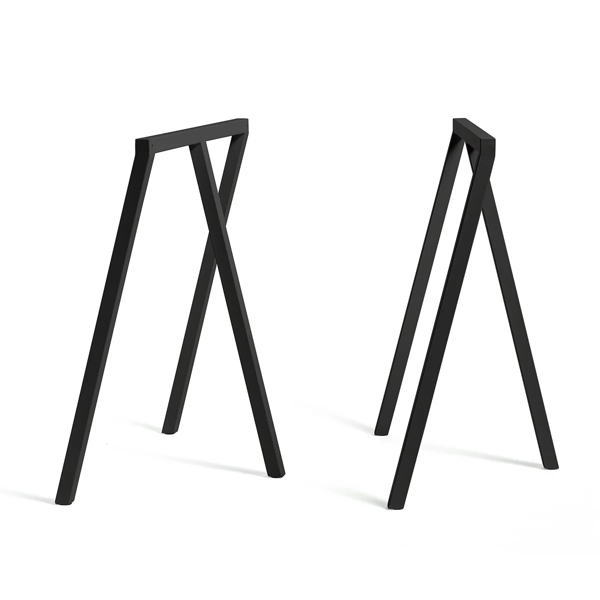 Les tréteaux sont une simplification du chevalet de sciage tel qu'on le connaît dans l'industrie. Ils sont en acier revêtu par poudre et sont disponibles en deux tailles : la variante un peu plus basse pour la table à manger ( Loop Stand Frame ) et la plus haute pour le bureau ( Loop Stand Frame High ). Comme les deux tréteaux sont livrés par set de deux, ils conviennent parfaitement comme base d'un plateau de table. Les trois pieds forment une base plus que solide. Dans les versions plus hautes, les tréteaux se transforment en portemanteau Loop .