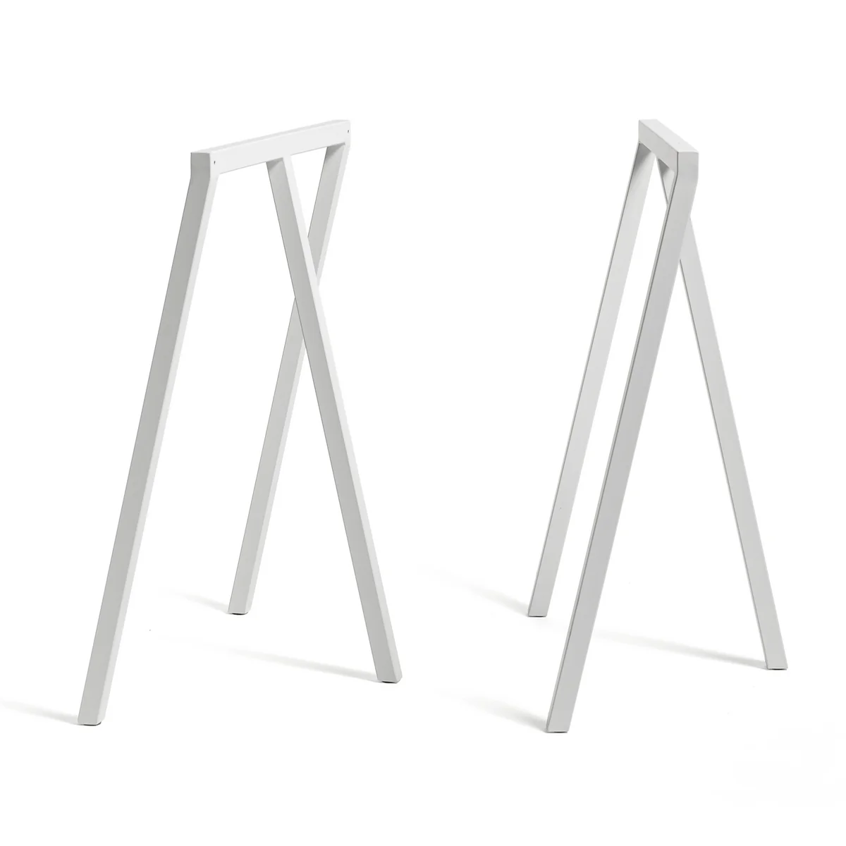 Les tréteaux sont une simplification du chevalet de sciage tel qu'on le connaît dans l'industrie. Ils sont en acier revêtu par poudre et sont disponibles en deux tailles : la variante un peu plus basse pour la table à manger ( Loop Stand Frame ) et la plus haute pour le bureau ( Loop Stand Frame High ). Comme les deux tréteaux sont livrés par set de deux, ils conviennent parfaitement comme base d'un plateau de table. Les trois pieds forment une base plus que solide. Dans les versions plus hautes, les tréteaux se transforment en portemanteau Loop .