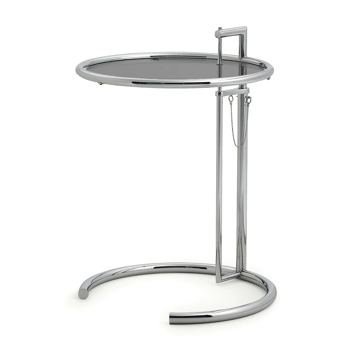 Le cadre réglable en hauteur de la table d'appoint est fabriqué en tube d'acier chromé. La version classique comporte un plateau en verre de cristal clair. En outre, la table ajustable est également disponible avec un plateau en verre Parsol gris ou un plateau en métal laqué noir.