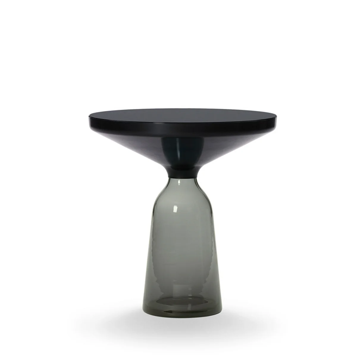 La table d'appoint Bell de Sebastian Herkner renverse l'utilisation habituelle des matériaux et surprend la perception : ici, le pied de la table se transforme en une forme de verre prégnante, colorée et transparente dans l'espace, sur laquelle repose un corps métallique.