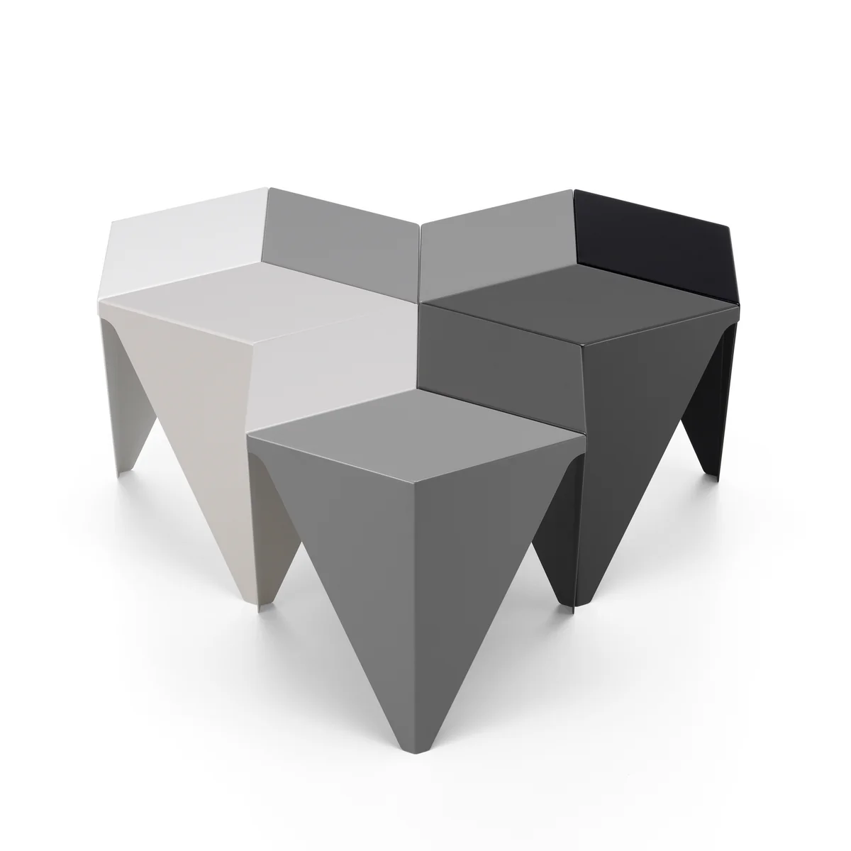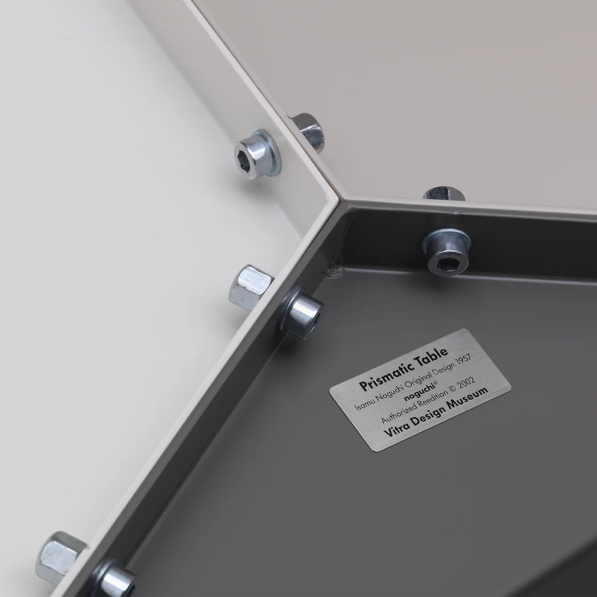 Noguchi Prismatic Table est basée sur un langage formel purement géométrique. Cette table d'appoint originale à trois pieds et au plateau hexagonal est réalisée en tôle d'aluminium pliée et s'est inspirée de la technique japonaise traditionnelle de pliage du papier.