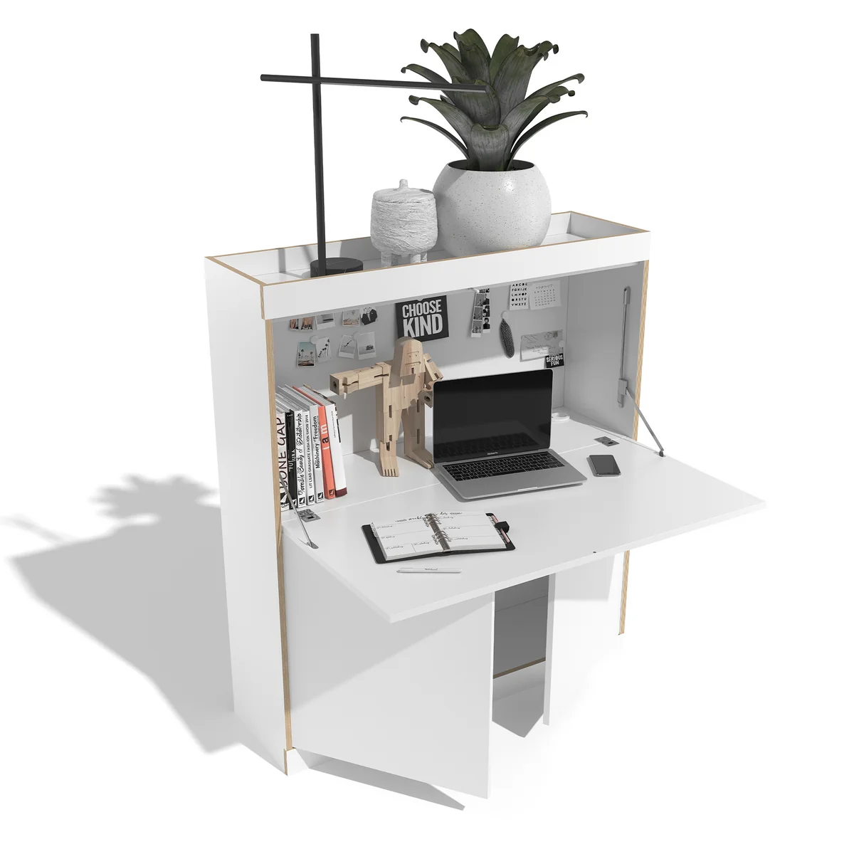 Le bureau Flai Le secrétaire Home-Office du duo de designers Kaschkasch pour Müller Small Living séduit par sa flexibilité. Grâce à la fonction push-to-open, aux supports d'abattants amortis, aux lampes intégrées ainsi qu'aux ouvertures pour le passage des câbles, le travail en home office est directement plus agréable. Le secrétaire compact offre suffisamment de place pour le travail quotidien dans le bureau à domicile. Lorsqu'il n'est pas utilisé, le bureau peut être replié de manière très flexible, ce qui permet de gagner de la place.