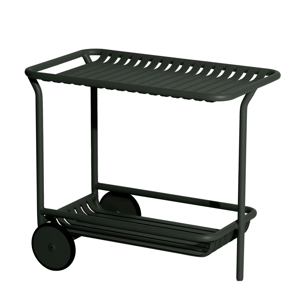 Le Week-End Trolley Outdoor de Petite Friture a été conçu, comme le reste de la Week-End série, a été conçu pour une utilisation pratique et durable. Fabriqué en aluminium, il est léger et sa peinture époxy granuleuse et mate le rend résistant aux UV et à l'eau. La structure lamellaire empêche en outre l'eau de s'accumuler sur ses surfaces.