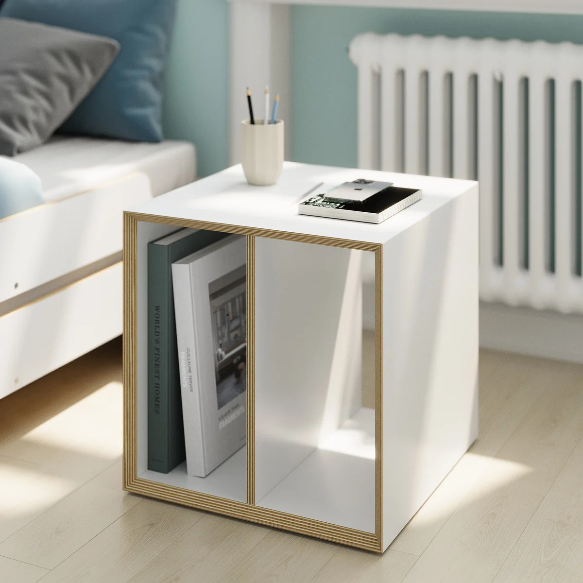 Le Vertiko Dice est un cube polyvalent et pivotant qui offre une flexibilité maximale. Avec ses dimensions compactes de 45 x 45 x 45 cm, ce module peut servir de table basse, de table d'appoint, de commode, de tabouret ou de table de chevet. La tablette intermédiaire intégrée divise la surface de rangement de manière pratique, selon que le cube est utilisé horizontalement ou verticalement. Vertiko Dice peut être posé seul ou combiné en groupe et est disponible en noir, blanc ou anthracite. Des patins en feutre protègent le sol et sont inclus dans la livraison.