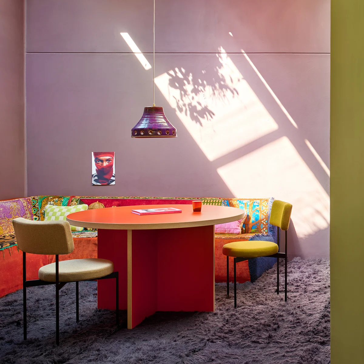 La table de salle à manger de la maison néerlandaise HKliving réunit toute la famille. Elle est disponible en différentes tailles et couleurs. La table ronde est disponible dans des couleurs sobres ou vives. Cet objet design intemporel est fabriqué à 70% en Eorolight, 22% en MDF, 7% en HPL et 1% en métal.
