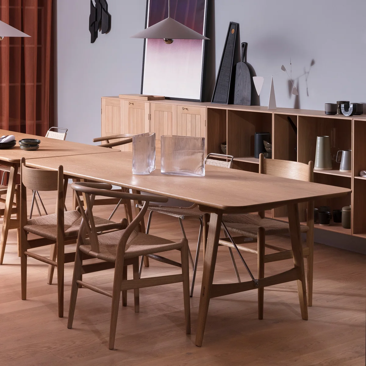 La table de salle à manger Hunting BM1160 de Carl Hansen est une création du designer danois Børge Mogensen des années 1960. Alors que la table et les pieds sont en bois massif, les diagonales sont en métal.