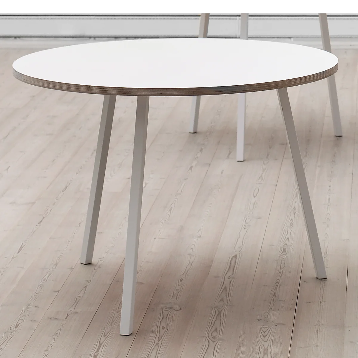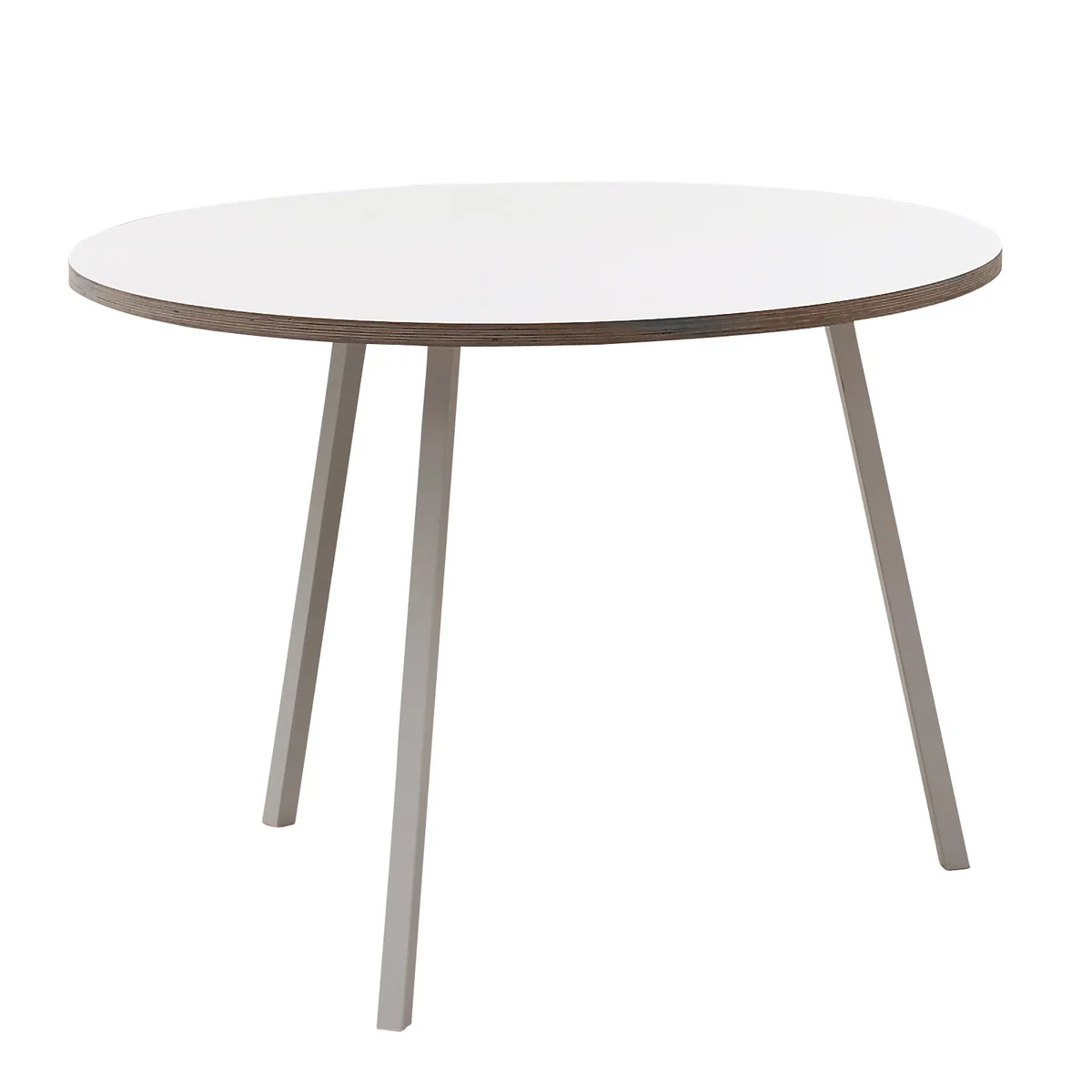 La surface lisse de la table ronde Loop Stand se termine par des bords nets. Dans la version noire, les plateaux de tables sont en Linoleum et les bords en bois de frêne laqués colorés, ce qui donne à la table avec ses trois pieds, un aspect noble et élégant. Dans la version blanche les bords du plateau de la table (stratifié) sont laissés en tons naturels de bois (contreplaqué), qui confère à Loop une apparence de cottage de vacances scandinave. Les pieds de la table de salle à manger et de la table de bistrot de HAY sont produits en acier.