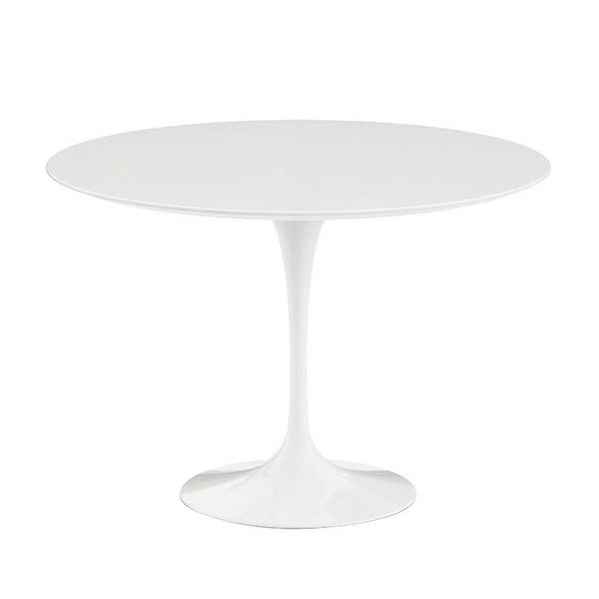 Knoll fabrique la table Saarinen Tulip avec un piétement en aluminium moulé avec revêtement Rilsan. Le plateau de table est en stratifié, disponible en différents placages de bois et en diverses variantes de marbre.