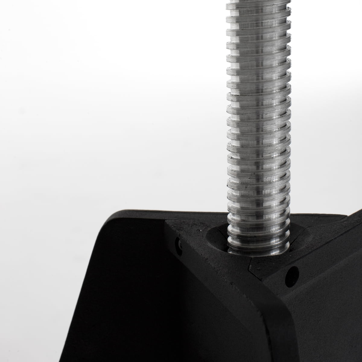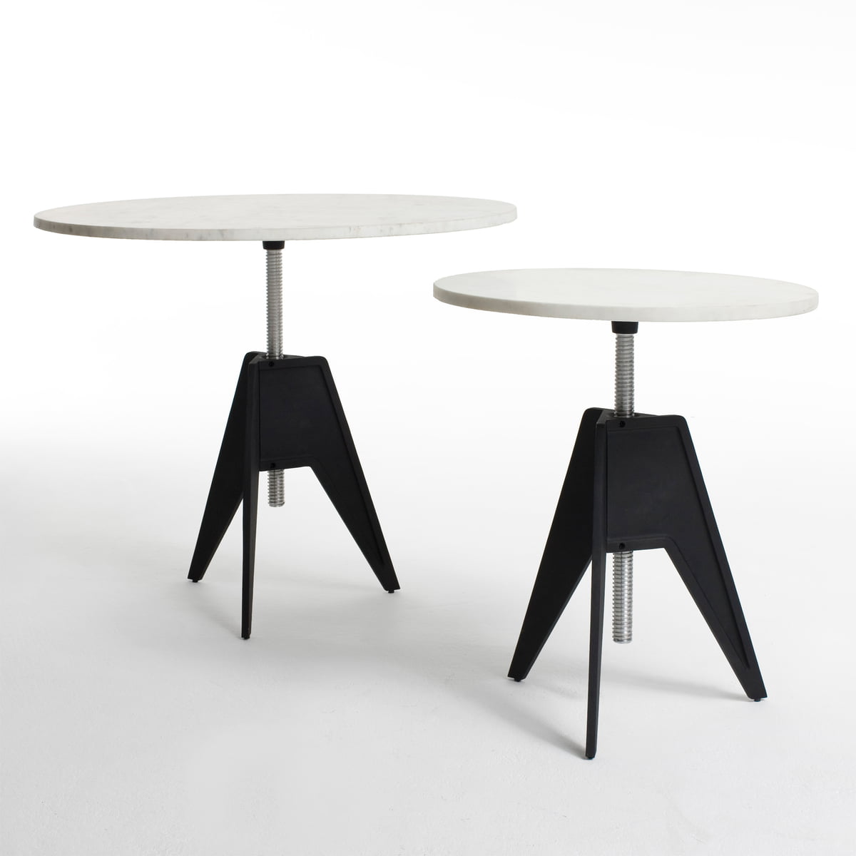 À première vue, la table rappelle une table de bistrot ou de salle à manger tout à fait classique. Au deuxième coup de œil, on observe que le plateau de table en marbre repose sur une vis de gros calibre en aluminium, qui permet, en tournant, un réglage à différentes hauteurs. Le plateau de table pivote simplement à l’aide de la vis pour atteindre la hauteur désirée et est ensuite bloquée à la hauteur choisie, par le boulon de verrouillage. Le châssis à trois pieds est réalisé en fer laqué noir.