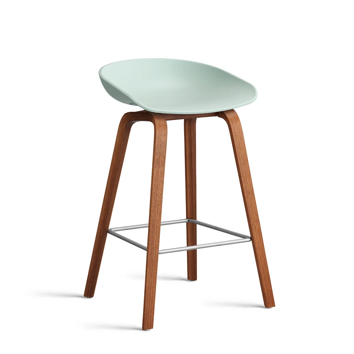 About A Stool AAS32 dispose d'une coque d'assise en polypropylène, le cadre est en contreplaqué de hêtre, disponible avec différentes combinaisons de placages et de repose-pieds.