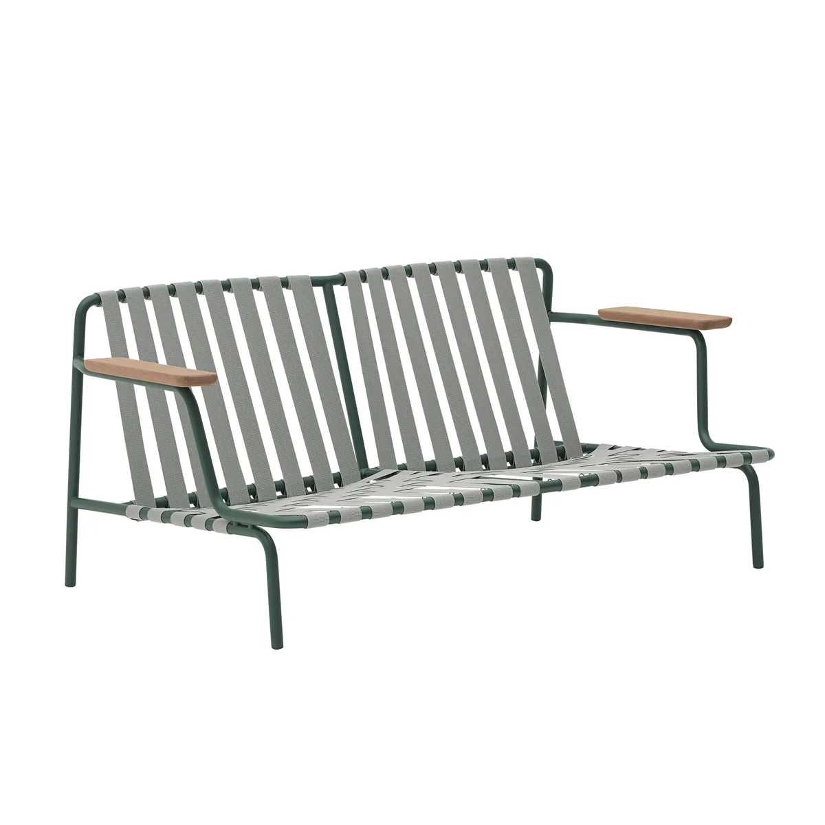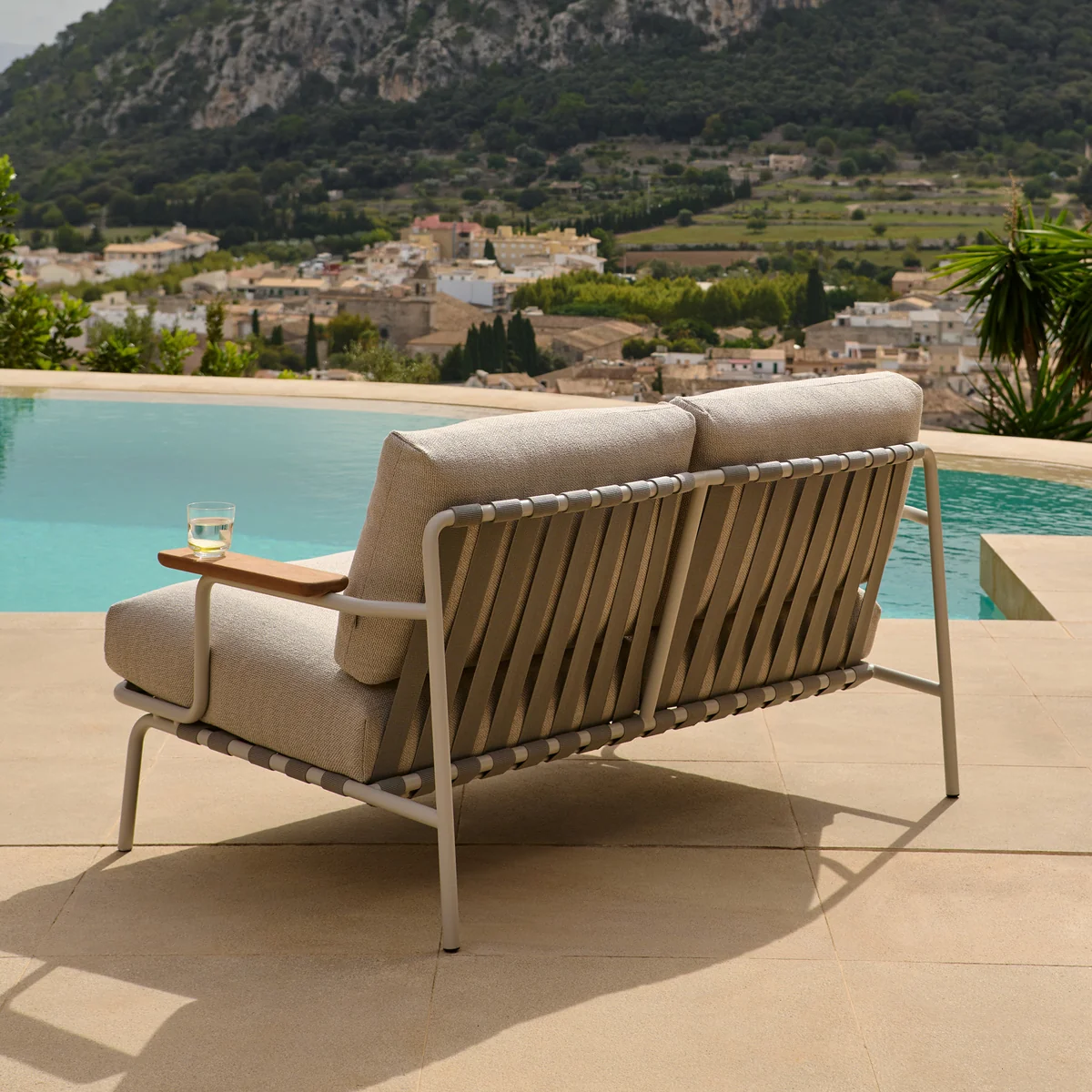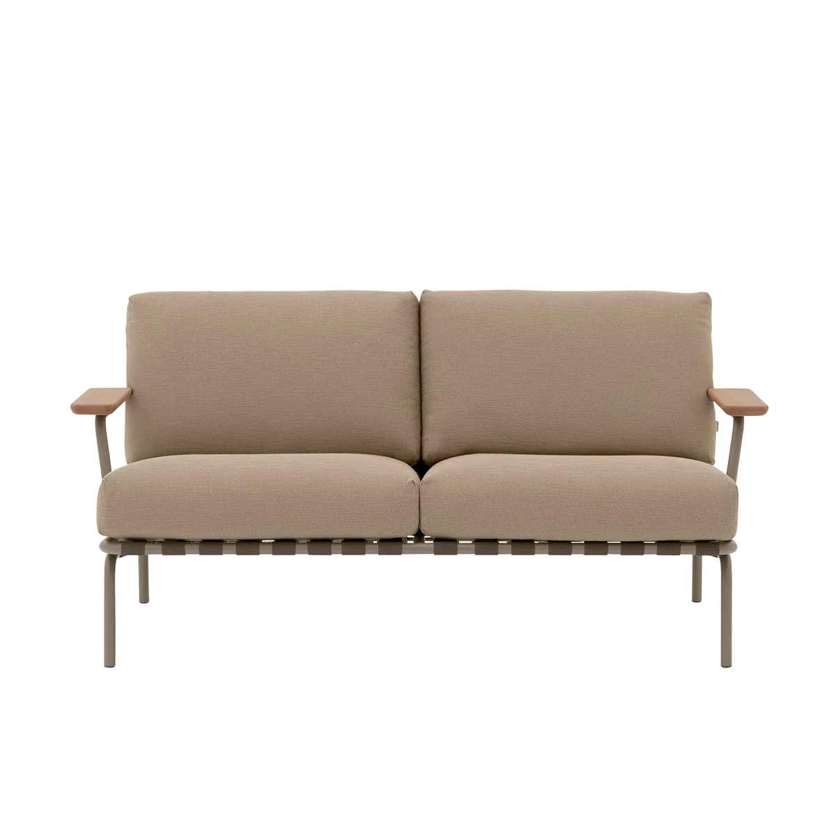 Le canapé 2 places Settle Outdoor allie un design scandinave moderne à un confort durable pour l'extérieur. La structure en acier aérée avec des détails de sangles visibles confère au canapé un aspect léger et élégant tout en assurant sa stabilité et sa résistance.