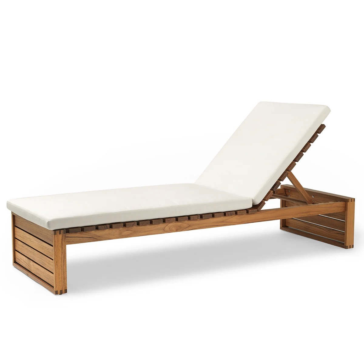Le support se compose de deux parties reliées l'une à l'autre, de sorte qu'il s'adapte au solarium lorsque l'appuie-tête est rabattu vers le haut. Dans les deux positions, la chaise longue et le support procurent un grand confort et se combinent parfaitement dans le jardin, sur la terrasse ou au bord de la piscine.