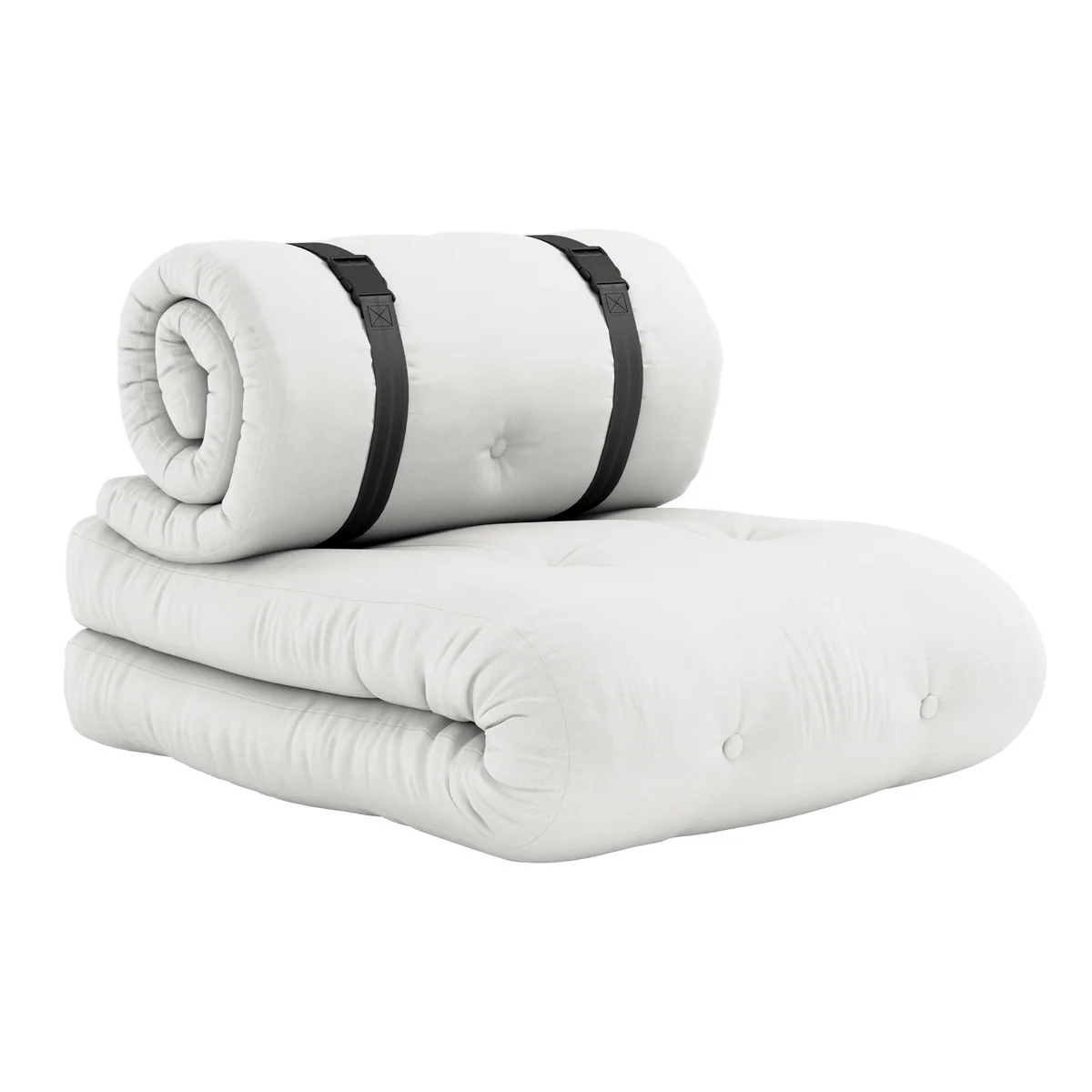 La chaise Buckle Up OUT de Karup Design vous invite à vous détendre au soleil et peut également être utilisée pour une petite sieste si nécessaire. Il se compose de deux matelas, l'un plié pour servir de siège et l'autre enroulé et attaché avec des sangles comme dossier. En relâchant les sangles et en enroulant le dossier sur le matelas épais, vous obtenez un lit extérieur confortable de 200 x 70 cm, sur lequel vous pouvez vous détendre confortablement.