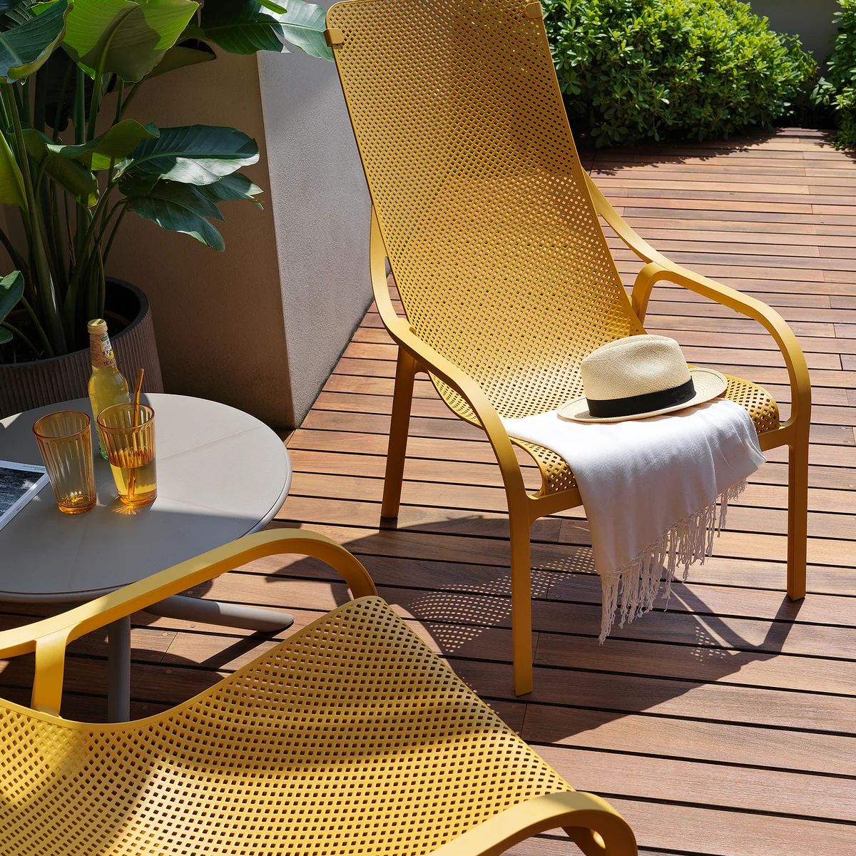 Le fauteuil lounge d'extérieur est fabriqué en polypropylène fiberglass entièrement coloré dans la masse et résistant aux UV, avec un effet mat. Le Net Lounge est empilable et équipé d'embouts de pied antidérapants et d'attaches pour fixer la serviette de plage.