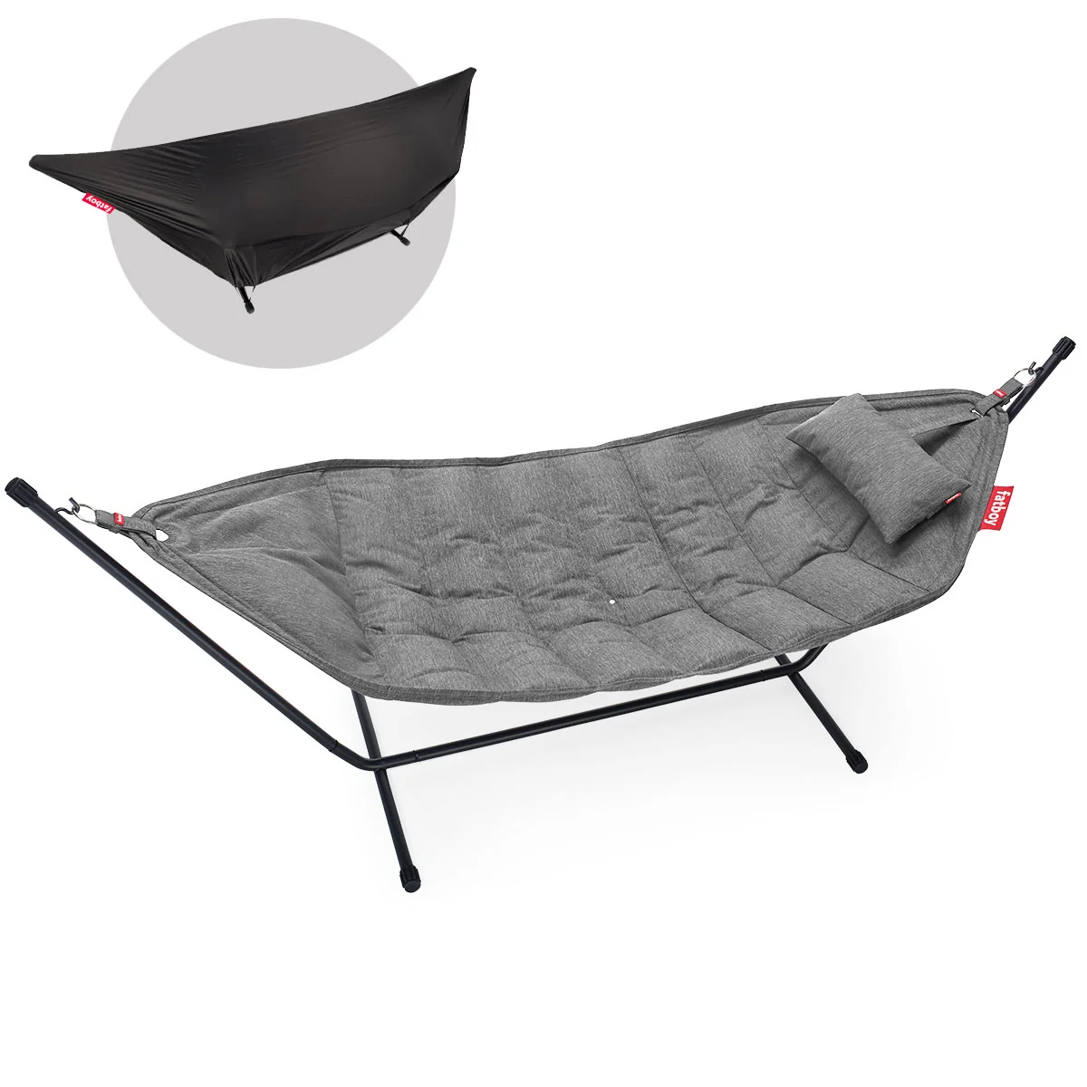 Le Headdemock hamac Superb Deluxe de Fatboy dispose, en plus du matelas lui-même, d'un coussin confortable, d'un support stable et d'une couverture de protection. Il convient à deux personnes (max. 150kg) et ne dépend pas d'une corde ou d'un arbre.