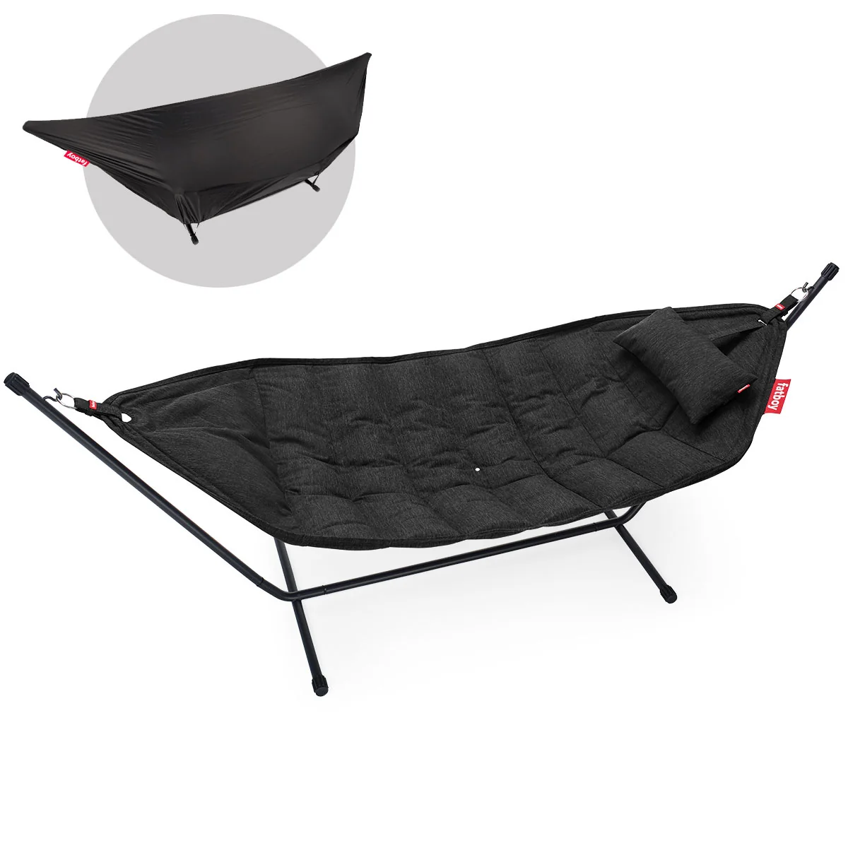 Le Headdemock hamac Superb Deluxe de Fatboy dispose, en plus du matelas lui-même, d'un coussin confortable, d'un support stable et d'une couverture de protection. Il convient à deux personnes (max. 150kg) et ne dépend pas d'une corde ou d'un arbre.