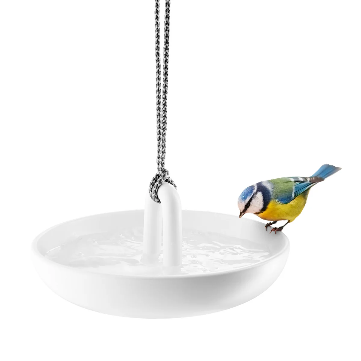 Le bain d'oiseau suspendu d'Eva Solo peut être placé sur le balcon ou dans le jardin et convient particulièrement aux petits oiseaux tels que les nichons. Le bain d'oiseaux est en céramique et peut être accroché rapidement et facilement à l'aide d'un cordon de nylon pratique, puis retiré à nouveau. Grâce aux matériaux résistants aux intempéries, la salle de bains peut être suspendue à l'extérieur toute l'année. Les oiseaux peuvent se baigner dans la coquille ou étancher leur soif.