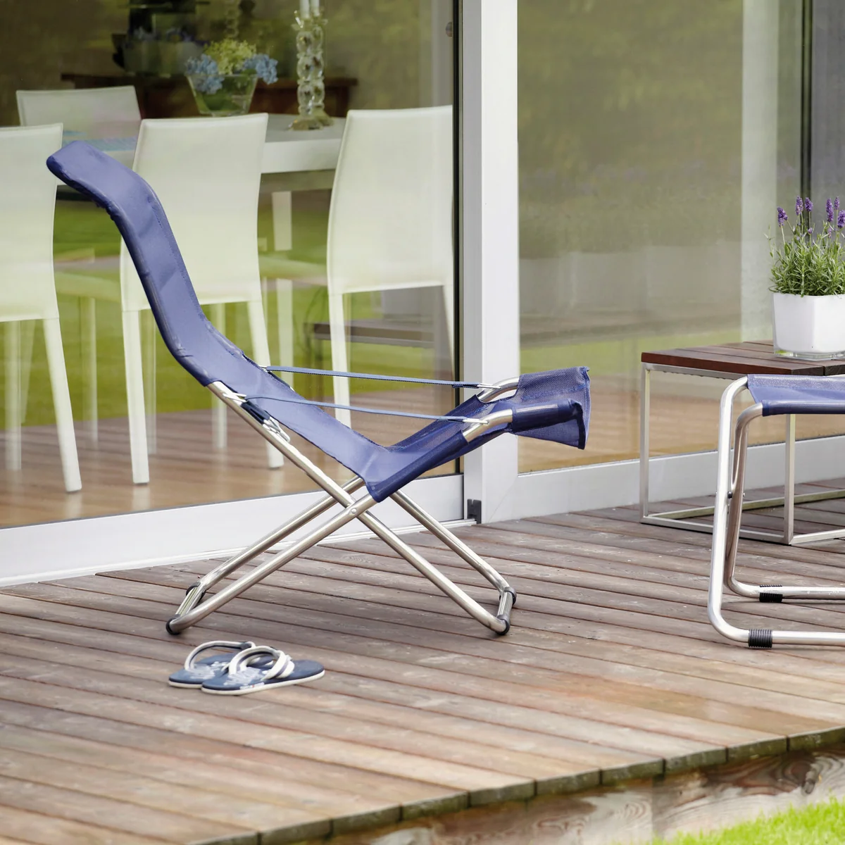 Le piètement de la chaise pliante, composé d'aluminium, est léger et se replie facilement. La toile du siège en aluminium de Fiam est composé de textilène, une étoffe haute technologie résistante aux intempéries et aux UV. Le textilène est si souple et perméable à l'air qu'on est assuré de pouvoir s'asseoir ou s'allonger agréablement sur ce siège d'extérieur. Ce tissu moderne est aussi facile à entretenir et à nettoyer.