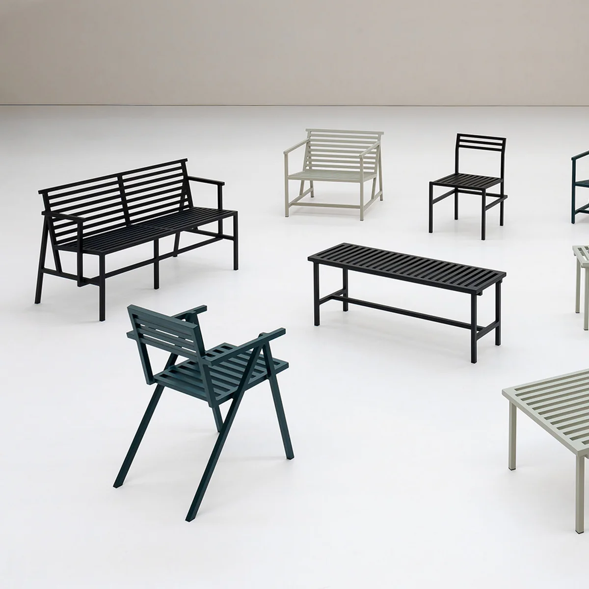 Chaque article de la série possède un design individuel. Le matériau, la couleur et les proportions de l'extrusion d'aluminium uniformisent l'ensemble de la collection. La base de la série '19 Outdoor' est le projet de design '19 Chairs' - 19 chaises ont été fabriquées en 19 jours, livrées à 19 endroits, retravaillées par 19 créatifs et ce pendant la phase COVID-19. Le but était de créer une réaction en faveur de l'Age UK & Resourcing Racial Justice, en ce qui concerne les dommages causés par les restrictions de COVID-19 au sein de la scène artistique.