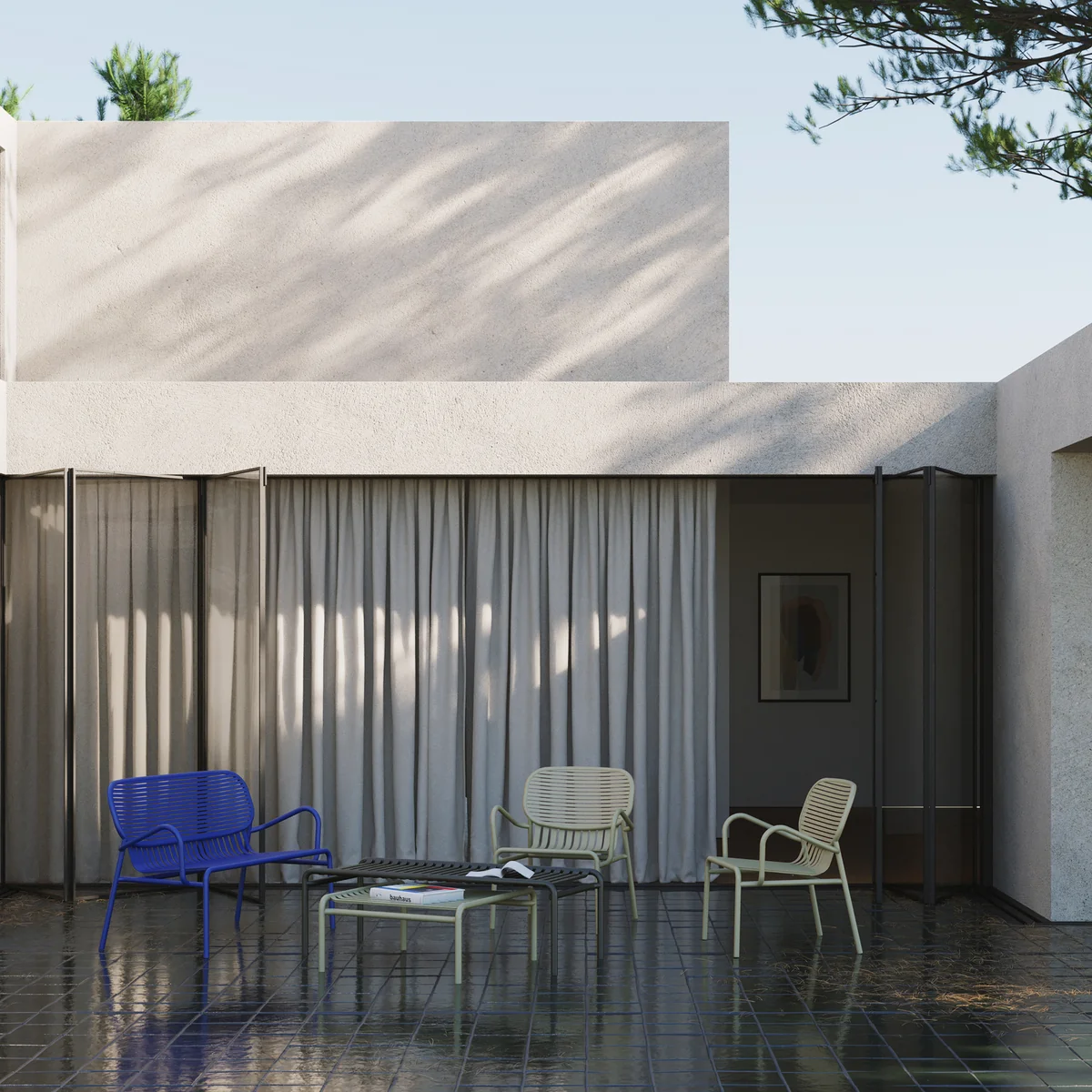 La structure présente également des caractéristiques pratiques, par exemple en permettant à l'eau de pluie de s'écouler facilement à travers les lattes sans former de flaques gênantes. Fabriqué en aluminium, le fauteuil, comme toutes les pièces de la série, est en outre particulièrement résistant aux intempéries.