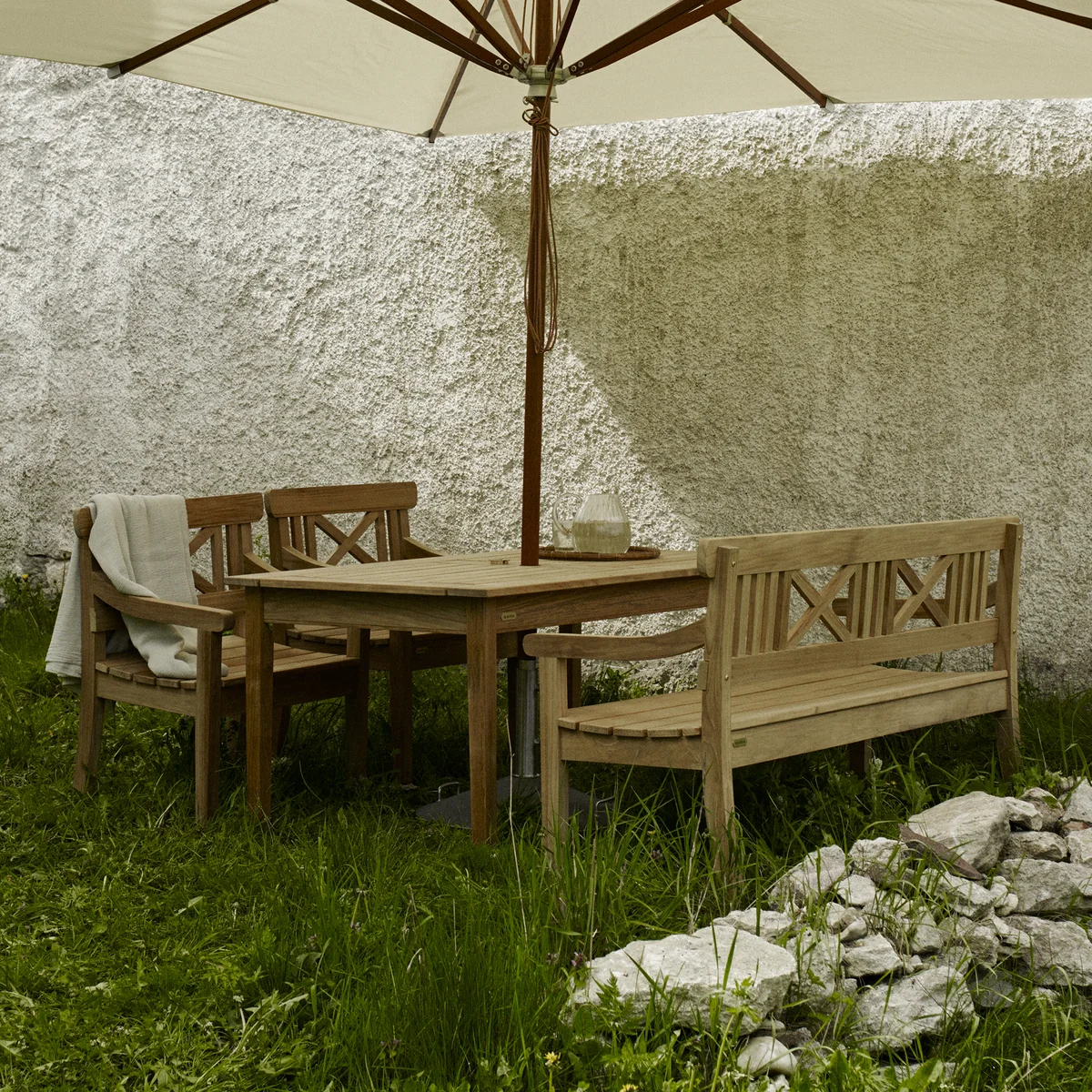 Le teck est dur, stable et très facile à travailler. En même temps, le bois se caractérise par une teneur unique en huiles d'imprégnation naturelles qui le rendent résistant à la pourriture et aux champignons. C'est pourquoi les meubles en teck de qualité supérieure peuvent rester dehors toute l'année, sans autre traitement qu'un nettoyage régulier. Ceux qui souhaitent conserver le beau jeu de couleurs du bois et qui désirent une teinte plus foncée peuvent traiter les meubles avec de l'huile. Sur demande, un coussin est disponible pour le Skagerak Drachmann banc est également disponible avec un coussin d'assise.
