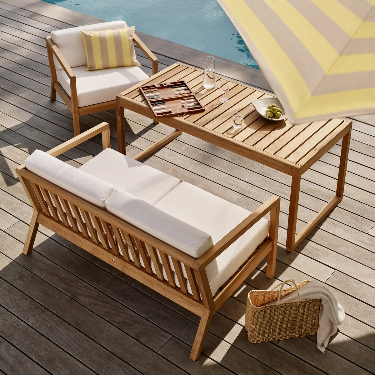 Le teck utilisé pour le cadre provient de forêts gérées durablement. En complément des coussins Barriere Panama résistants aux intempéries, le fauteuil Virkelys invite à lire et à se détendre confortablement en été.